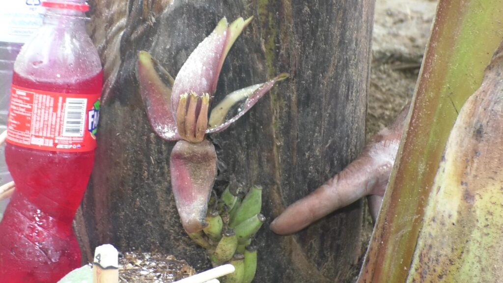 จึงเดินทางไปตรวจสอบ ที่สวนกล้วยของ นายเวียน พลมะนะ อายุ 67 ปี พบชาวบ้านจำนวนหนึ่ง กำลังจัดเตรียมดอกไม้ธูปเทียน และเครื่องเซ่นไหว้ ตั้งจิตอฐิษฐานขอพร ประกอบพิธีตามความเชื่อ ขอโชคขอลาภจากต้นกล้วยประหลาด ซึ่งพบว่าแตกต่างจากต้นกล้วยทั่วไป หลังมีหัวปลีและหวีกล้วย โผล่ออกจากโคนต้น สูงจากพื้นดินเพียงเล็กน้อย ลักษณะชี้ขึ้นด้านบน นับได้จำนวน 8 หวี และนับผลกล้วยได้จำนวน 14 ลูก จากนั้นผู้เข้าร่วมพิธี ก็ได้นำแป้งฝุ่น ลูบเบาๆจากล่างขึ้นบน 3 ครั้ง พร้อมจุดธูปเสี่ยงทาย เมื่อธูปหมด กลับปรากฎตัวเลข 3 ตัวตรงกันเป๊ะ 4 1 8 ซึ่งตรงกับจำนวนกล้วย 8 หวี 14 ผล สร้างความฮือฮาแก่ผู้เข้าร่วมพิธี ต่างพากันได้เลขเด็ดสมใจ เตรียมนำไปเสี่ยงโชคเสี่ยงดวง ในช่วงโค้งสุดท้ายก่อนหวยออก