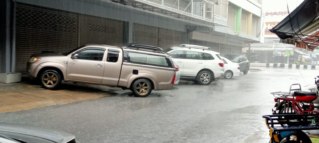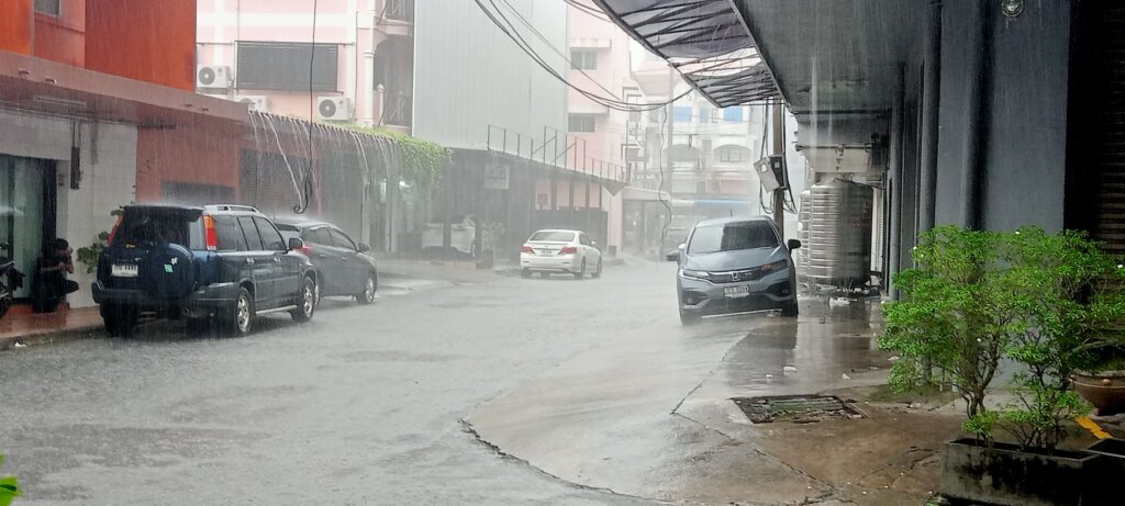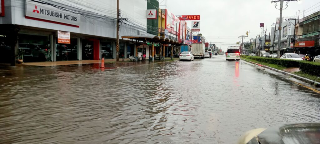 ส่งผลให้น้ำท่วมฉับพลันถนนหลายสาย น้ำรอระบายเอ่อเข้าห้างร้านในตัวเมือง