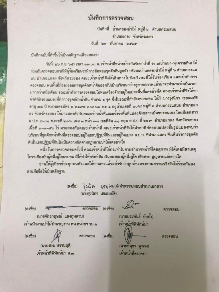 จากนั้นทางเจ้าหน้าที่ป่าไม้จังหวัดระยองได้ลงพื้นที่ตรวจสอบโดยมีเจ้าหน้าที่จำนวน6นายได้ลงพื้นที่ตรวจสอบแนวเขตในที่ดินดังกล่าวที่มีการขุดตักหน้าดินแล้วนำไปขายจึงได้พิสูจน์และตรวจสอบแนวเขตและแผนที่ทางอากาศจึงได้พบว่าพื้นที่ดังกล่าวที่ผู้กระทำความผิดนั้นเป็นพื้นที่แนวเขตของปฏิรูปที่ดินหรือว่า ส.ป.ก. จึงได้มาร้องเรียนกับสื่อมวลชนให้เป็นกระบอกเเสียงแทนชาวบ้านโดยอยากให้หน่วยงานปฏิรูปที่ดินจังหวัดระยองลงพื้นที่มาสำรวจและตรวจสอบแนวเขตของผู้กระทำความผิดโดยด่วนและรีบดำเนินการแจ้งข้อกล่าวหาดำเนินคดีต่อภาครัฐทั้งทางแพ่งและอาญาต่อไป..