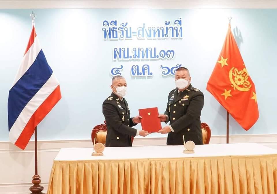 เวลา 10.10 น. วันที่ 4 ตุลาคม 2565 ที่มณฑลทหารบกที่ 13 อำเภอเมืองลพบุรี จังหวัดลพบุรี ได้กระทำพิธีลงนาม เพื่อส่งมอบการบังคับบัญชาและมอบธงประจำหน่วย ระหว่าง พลโทธนสิน สุขโข อดีต ผู้บัญชาการมณฑลทหารบกที่ 13 ที่ได้รับพระราชทานตำแหน่งให้เป็น ที่ปรึกษากองทัพบก ได้กระทำพิธี รับ – ส่ง หน้าที่ให้กับ พลตรี สิทธิชัย คัตตะพันธ์ ผู้บัญชาการมณฑลทหารบกที่ 13 ท่านใหม่ โดยมีคณะนายทหารชั้นผู้ใหญ่ ทหารชั้นประทวน ลูกจ้าง ร่วมในการประกอบพิธีครั้งนี้อย่างสมเกียรติ ซึ่งทางอดีต ผู้บัญชาการมณฑลทหารบกที่ 13 ได้กล่าวขอบในกำลังพลทุกนายที่ให้ความร่วมมือเป็นอย่างดีในการช่วยพัฒนาหน่วยให้ก้าวหน้า รวมทั้งได้ชื่นชมว่าผู้บัญชาการมณฑลทหารบกที่ 13 ท่านใหม่ เป็นผู้ที่มีความสามารถที่จะพัฒนาหน่วยให้กว้าหน้าต่อไป โดยทางผู้บัญชาการมณฑลทหารบกที่ 13 ท่านใหม่ ได้กล่าวว่า จะขอดำเนินการสานต่อเกี่ยวกับภารกิจต่าง ๆ ที่ยังค้างอยู่ให้สำเร็จ รวมทั้งจะเจริญรอยตามการทำงานของอดีตผู้บังคับบัญชาที่ผ่าน ๆ มาที่ได้สร้างชื่อเสียงให้กับหน่วย จนเป็นที่ยอมรับของกองทัพบกมาทุกยุคทุกสมัยและจะพัฒนาหน่วยให้เจริญก้าวหน้าต่อไป