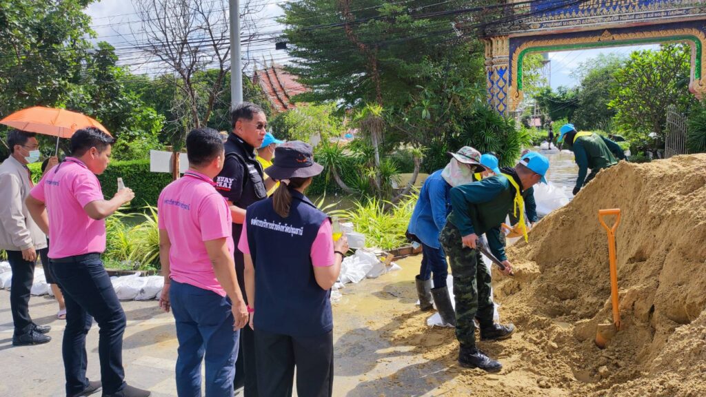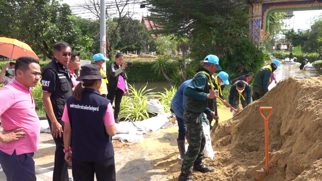 นายพีระศักดิ์ พงษ์พุฒิพัฒน์ นายกองค์การบริหารส่วนตำบลบ้านปทุม กล่าวว่า เนื่องจากระดับน้ำขึ้นเร็วมาก เราจึงต้องนำกระสอบทรายกั้นแนวถนน เบื้องต้นได้ทำแนวกั้นน้ำไว้ดีแล้ว เพียงแต่ว่าบริเวณโรงเหล็กที่มีแนวคันกั้นน้ำพัง จึงได้ให้น้ำเอ่อเข้าท่วมถึงวัดถั่วทอง
