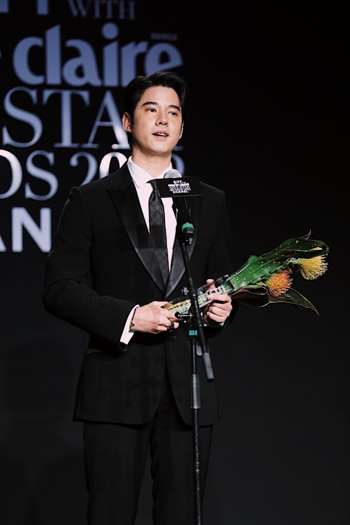 “ขอขอบคุณ นิตยสาร มารี แคลร์และ เทศกาลภาพยนตร์นานาชาติปูซาน สำหรับรางวัลในครั้งนีั และขอขอบคุณอาจารย์ ม.ล.พันธุ์เทวนพ เทวกุล ผู้ที่สอนให้รู้จักว่า การแสดง สามารถเปลี่ยนโลกได้ ถึงแม้ว่า ท่านจะไม่อยู่บนโลกนี้แล้ว แต่ก็ยังอยู่ในจิตใจของพวกเราเสมอ และเชื่อว่าเมื่อเรามองขึ้นไปบนฟ้า เราจะพบว่ารอยยิ้มของท่านจะไม่เคยจางหายไปไหน ครับ”