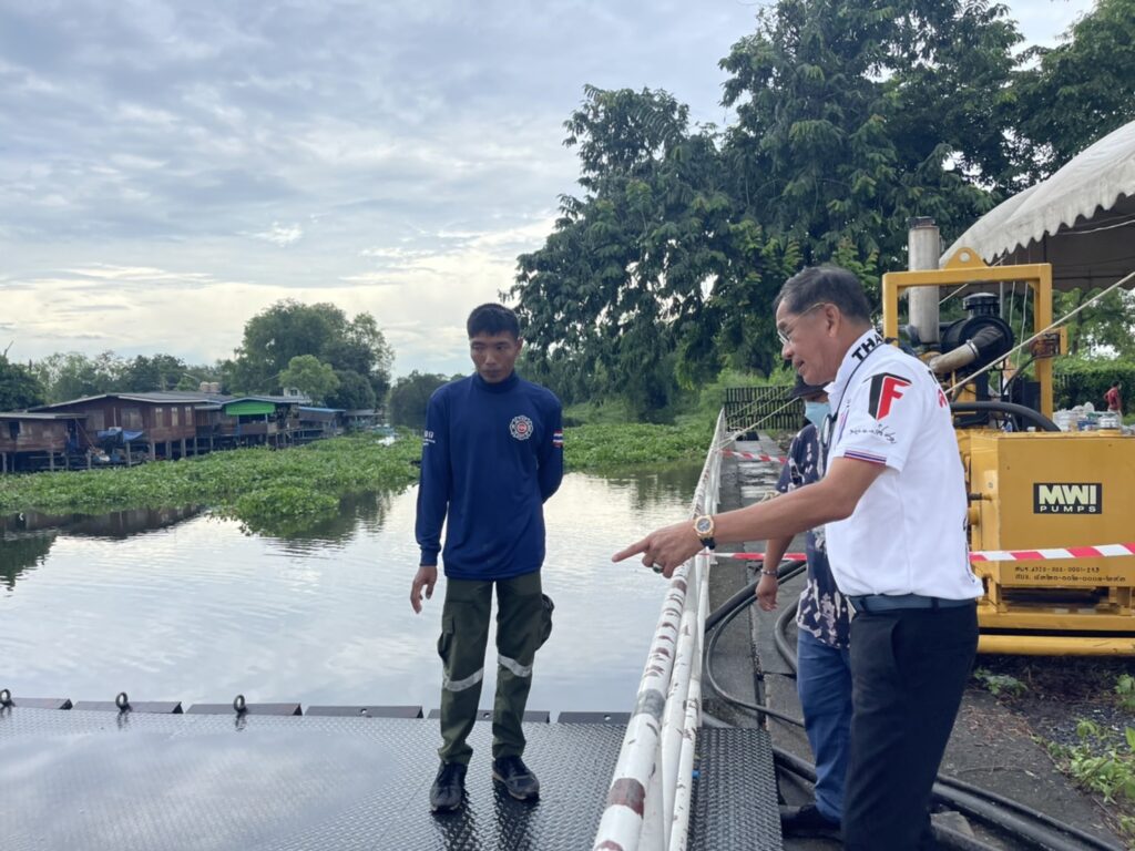 นายพีระศักดิ์ พงษ์พุฒิพัฒน์ นายกองค์การบริหารส่วนตำบลบ้านปทุม กล่าวว่า ช่วงเวลาน้ำขึ้นในช่วงเย็นและกลางคืนจะต้องตระเวนดูระดับน้ำว่าขึ้นมาเยอะหรือไม่ และได้ทำการเสริมกระสอบทรายตลอดแนว จุดไหนพบว่าต่ำต้องรีมนำกระสอบทรายเสริม เวลาฝนตกด้านในแนวกั่นน้ำหากมีน้ำท่วมขัง เราก็ต้องสูบน้ำจากด้านในเพื่อช่วยเหลือชาวบ้าน ส่วนระดับน้ำในเจ้าพระยาจะสูงกว่าด้านในอยู่ประมาณ 120-130 เซนติเมตร อีกประมาณ 60-70 เซนติเมตร จะเท่ากับน้ำปี 2554.