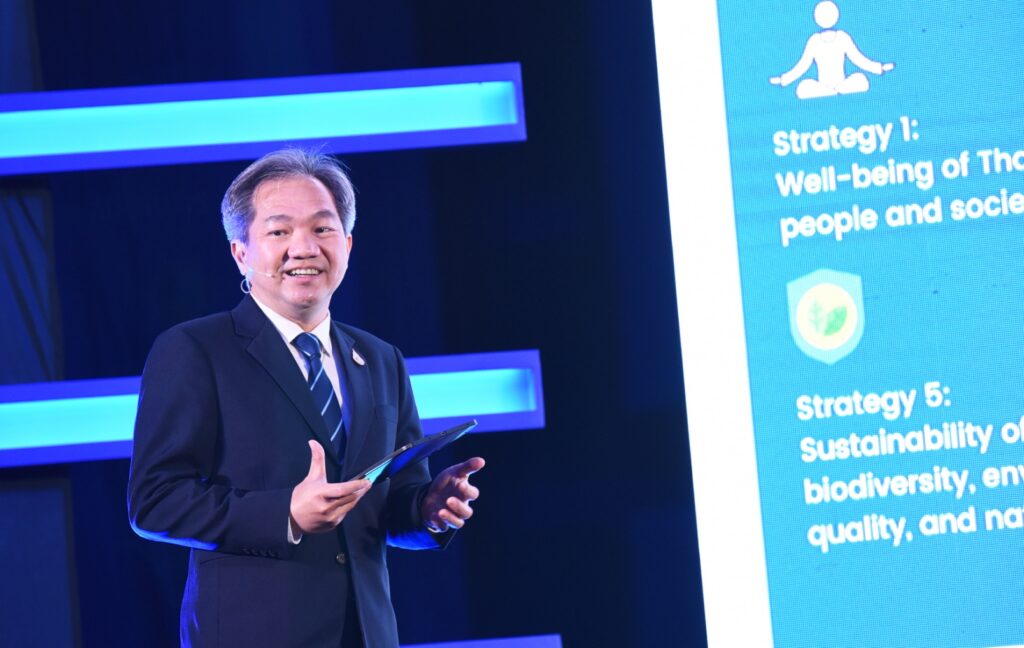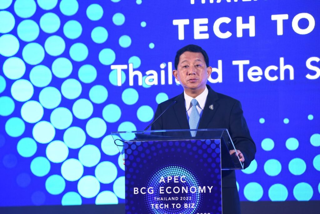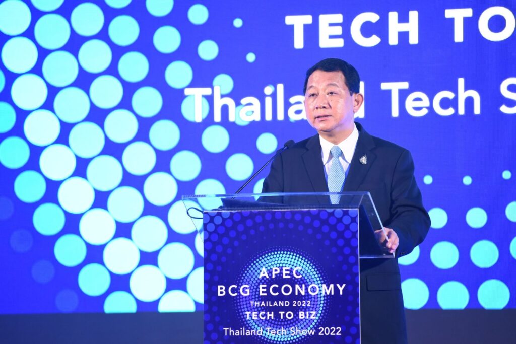 ศาสตราจารย์ ดร.นายแพทย์สิริฤกษ์ ทรงศิวิไล ปลัดกระทรวง (อว.) ประธานเปิดงานและปาฐกถาหัวข้อ “บทบาทกระทรวง (อว.) ในการผลักดันเศรษฐกิจ BCG วาระแห่งชาติของประเทศไทย” กล่าวว่า มีความยินดีอย่างยิ่งกับการเปิดงาน “APEC BCG Economy Thailand 2022: Tech to BIZ” (Thailand Tech Show 2022) ครั้งนี้ ซึ่งไม่เพียงเป็นเวทีที่จะนำเสนอการขับเคลื่อนวาระแห่งชาติ คือ โมเดลเศรษฐกิจ BCG (Bio-Circular-Green) Economy ที่กระทรวง (อว.) โดย (สวทช.) เป็นหน่วยงานหลักในการขับเคลื่อนและผลักดันให้เกิดกิจกรรมที่ส่งเสริมความร่วมมือทั้งด้านการค้าการลงทุน และความร่วมมือทางวิชาการ เพื่อสนับสนุนการเป็นเจ้าภาพประชุมผู้นำเขตเศรษฐกิจเอเปค APEC Thailand 2022 เท่านั้น แต่ยังส่งเสริมต่อเป้าหมายการพัฒนาที่ยั่งยืน (Sustainable Development Goals : SDGs) ซึ่งเป็นสิ่งที่ทั่วโลกกำลังให้ความสำคัญ