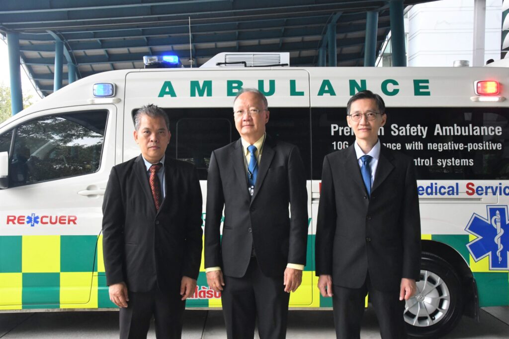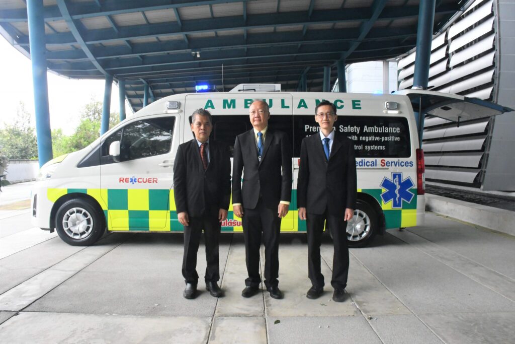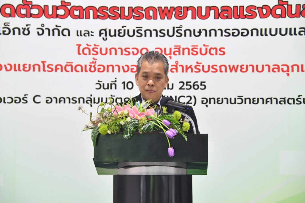 วันที่ 10 ตุลาคม 2565 ณ อุทยานวิทยาศาสตร์ประเทศไทย จ.ปทุมธานี : กระทรวงการอุดมศึกษา วิทยาศาสตร์ วิจัยและนวัตกรรม (อว.) สำนักงานพัฒนาวิทยาศาสตร์และเทคโนโลยีแห่งชาติ (สวทช.) โดย ศูนย์บริการปรึกษาการออกแบบและวิศวกรรม (DECC) ร่วมกับ บริษัท อาร์เอ็กซ์ จำกัด จัดแถลงข่าวเปิดตัวนวัตกรรมรถพยาบาลแรงดันลบ โดยมี ดร.สมบุญ สหสิทธิวัฒน์ ผู้ช่วยผู้อำนวยการสำนักงานพัฒนาวิทยาศาสตร์และเทคโนโลยีแห่งชาติ และ ภก.ชาญชัย อุดมลาภธรรม ประธานบริหาร บริษัท อาร์เอ็กซ์ จำกัด ร่วมเป็นประธานแถลงข่าว พร้อมด้วย นายอัมพร โพธิ์ใย ผู้อำนวยการ ศูนย์บริการปรึกษาการออกแบบและวิศวกรรม (สวทช.)