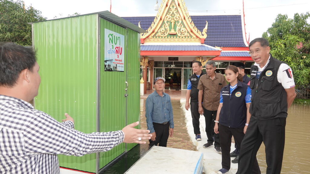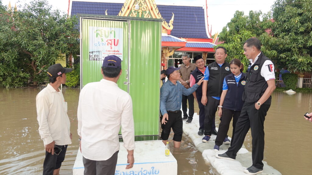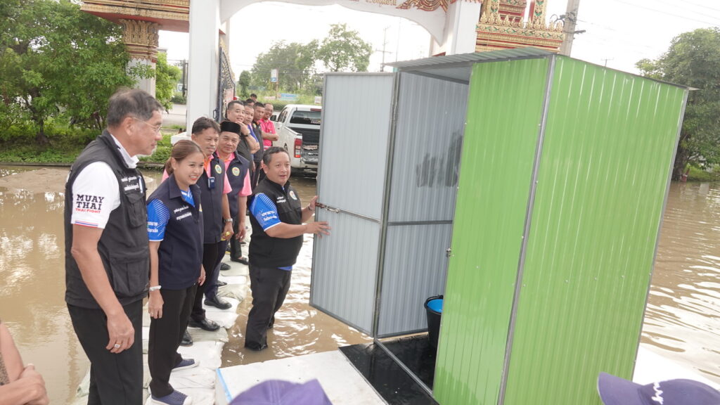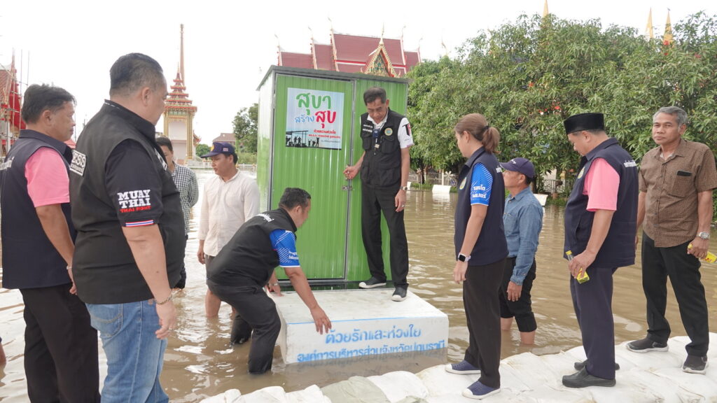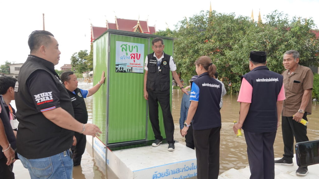 เมื่อเวลา 16.00 น. วันที่ 11 ตุลาคม 2565 ที่วัดสามัคคิยาราม (วัดเมี่ยง) ต.คลองควาย อ.สามโคก ปทุมธานี พล.ต.ท.คำรณวิทย์ ธูปกระจ่าง นายก อบจ.ปทุมธานี ได้มอบหมายให้นายยอด ภู่เฉลิมตระกูล นายก อบต.คลองควาย และทีมงานดำเนินการจัดทำสุขาลอยน้ำด้วยแพโฟม เพื่อบรรเทาทุกข์ให้กับพี่น้องประชาชนจำนวนมากที่ประสบภัย จากสถานการณ์น้ำท่วมในพื้นตำบลคลองควายที่อาศัยอยู่ริมฝั่งแม่น้ำเจ้าพระยา