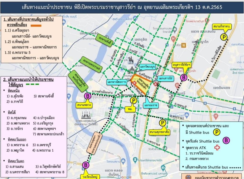 กองบัญชาการตำรวจนครบาล (บช.น.) จึงขอประชาสัมพันธ์ให้ผู้ที่ใช้เส้นทางสัญจรตามปกติ ให้ไปใช้เส้นทางที่แนะนำจะเป็นการสะดวกกว่า ทั้งนี้ บช.น. ได้จัดเจ้าหน้าที่ตำรวจจราจร คอยอำนวยความสะดวกด้านการจราจรในพื้นที่การจัดงานพิธีฯ และพื้นที่ต่อเนื่องอย่างเต็มกำลัง หากต้องการทราบข้อมูลสภาพการจราจร และสอบถามข้อมูลเส้นทางเพิ่มเติม สามารถสอบถามได้ที่ ศูนย์ควบคุมและสั่งการจราจร (บก.02) หมายเลขโทรศัพท์ 1197 ได้ตลอด 24 ชั่วโมง หรือทางเว็บไซต์ WW.TRAFFICPOLICE.GO.TH และสามารถดาวน์โหลดแผนที่จราจรเพื่อหลีกเลี่ยงเส้นทางได้ที่ Facebook 1197
