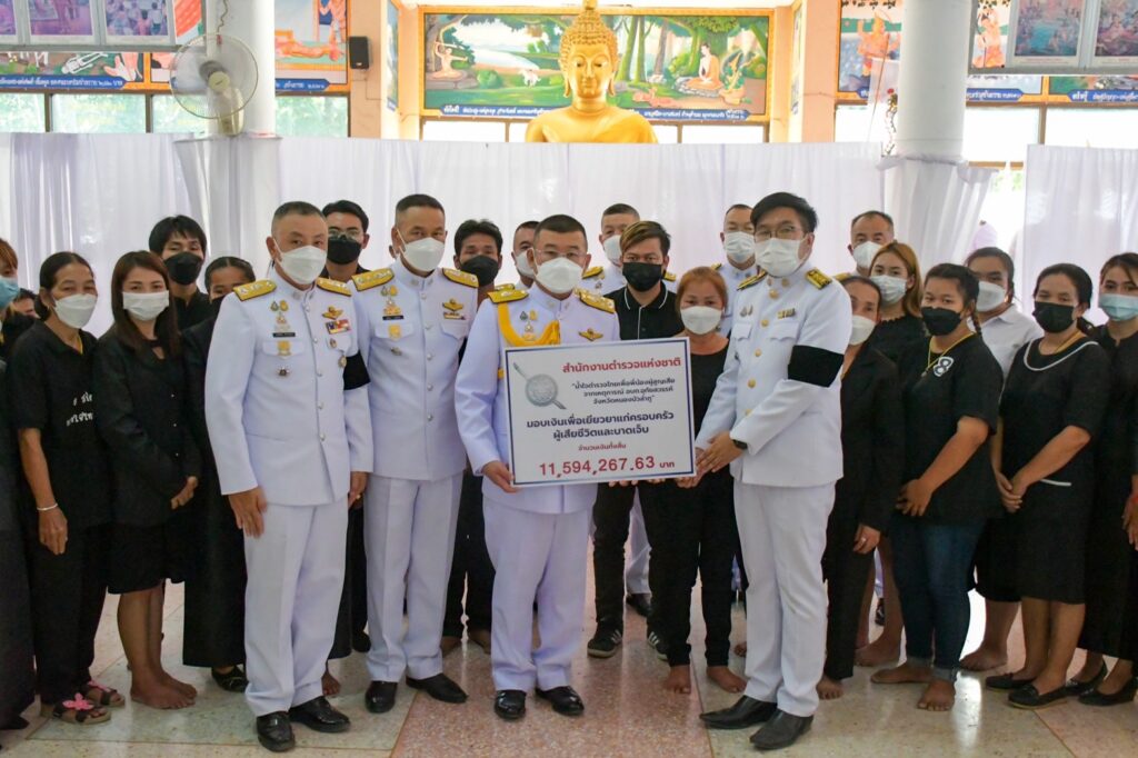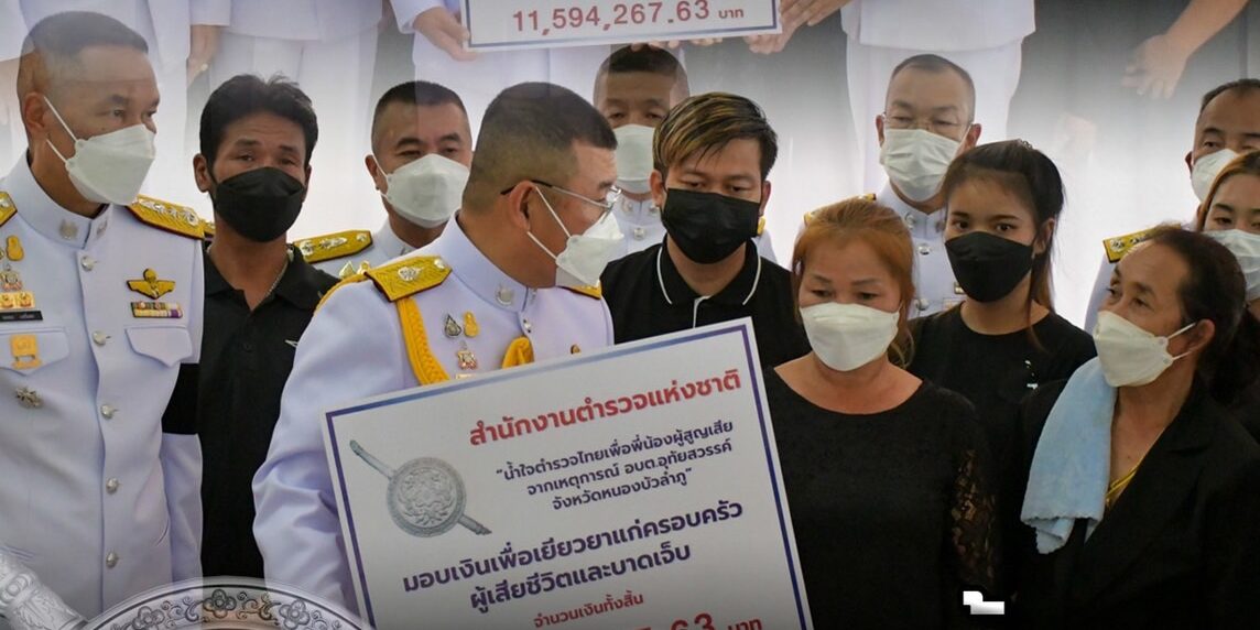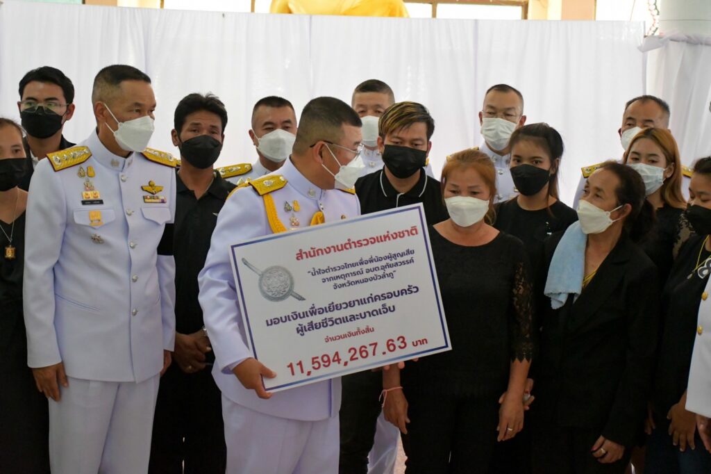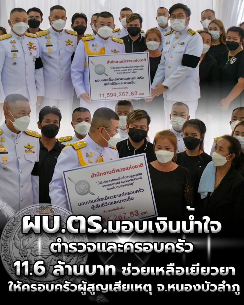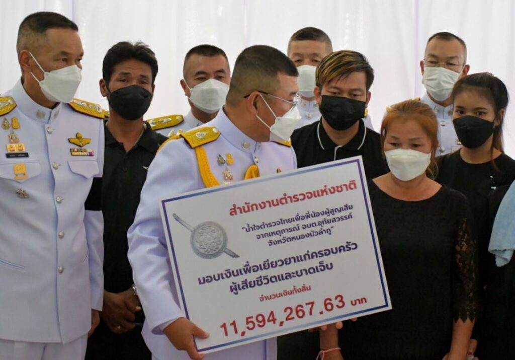 “วันนี้ได้แจ้งยอดเงินให้กับครอบครัวผู้เสียชีวิตและบาดเจ็บทราบในเบื้องต้น โดยครอบครัวผู้เสียชีวิตจะได้รับ รายละ 290,000 บาท ผู้บาดเจ็บสาหัส รายละ 230,000 ส่วนผู้บาดเจ็บเจ็บไม่สาหัส รายละ 115,000 โดยจะทำการมอบจริงในวันที่ 18 ต.ค.65 ซึ่งจะมีผู้บังคับการตำรวจภูธรจังหวัดหนองบัวลำภู และ รองผู้บังคับการฯ เป็นตัวแทนมอบ คาดว่าจะมีเงินบริจาคมากถึงกว่า 12 ล้าบาท ทั้งนี้เพื่อเป็นขวัญและกำลังใจ และอยากให้รู้ว่ายังมีคนอีกมากที่คอยให้กำลังใจอยู่ ต้องขอขอบคุณในน้ำใจของทุกท่านที่ร่วมกันบริจาค” พล.ต.อ.ดำรงศักดิ์ฯ กล่าวในที่สุด