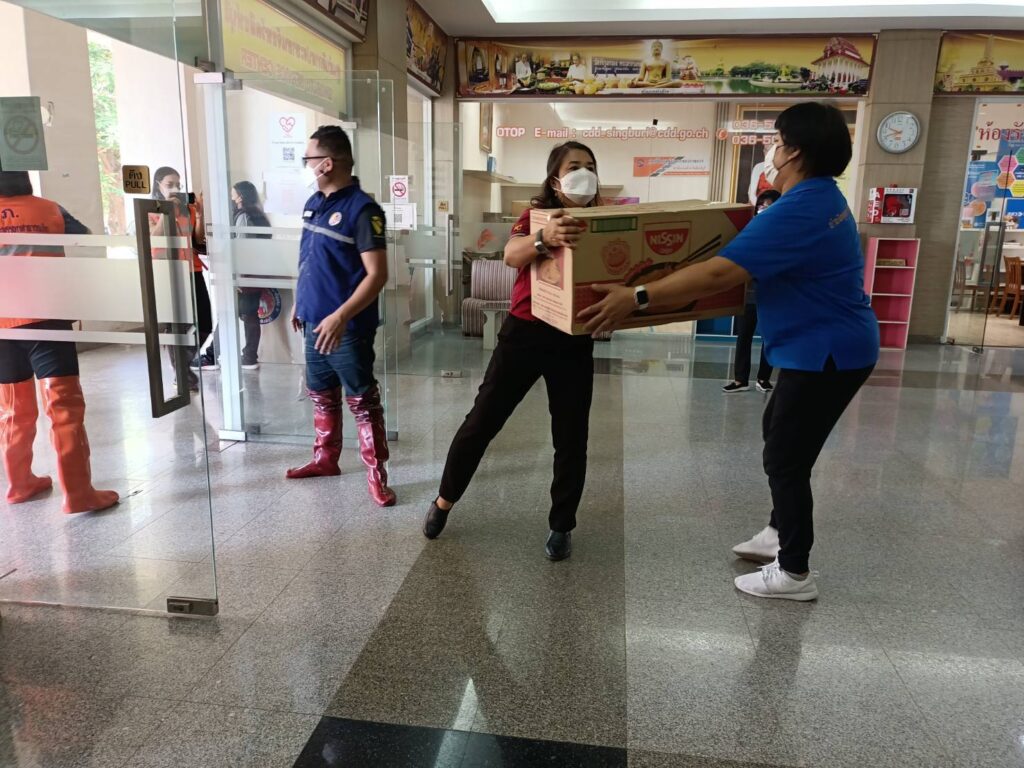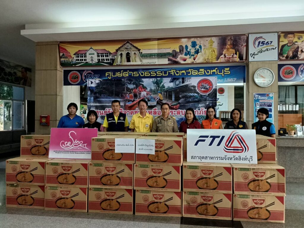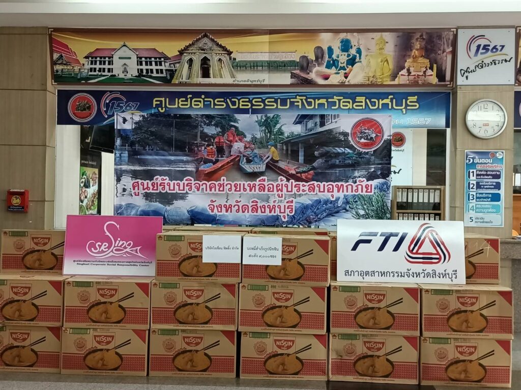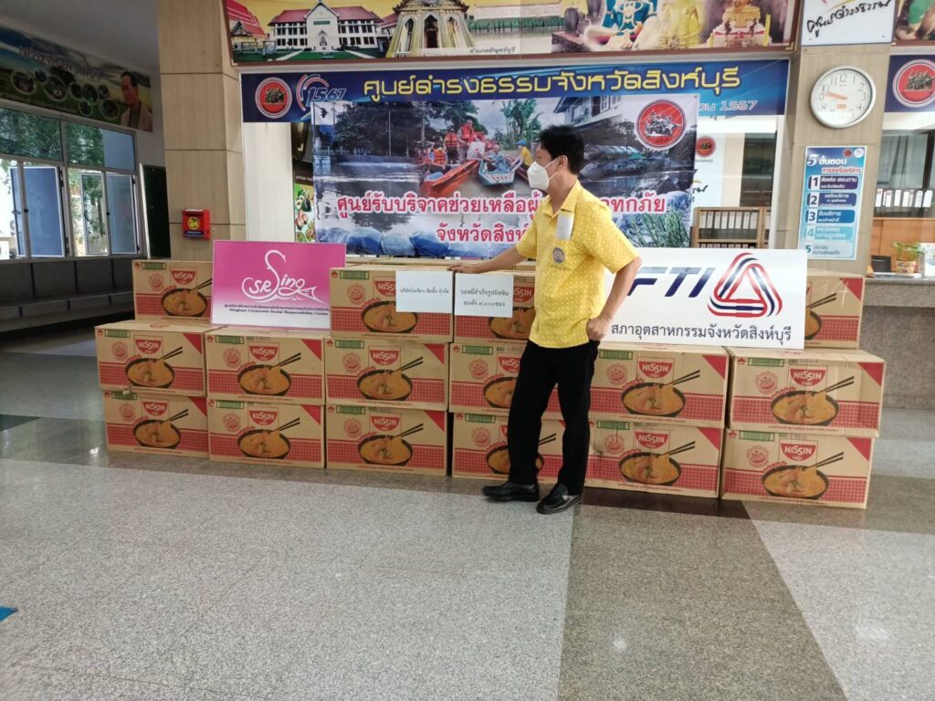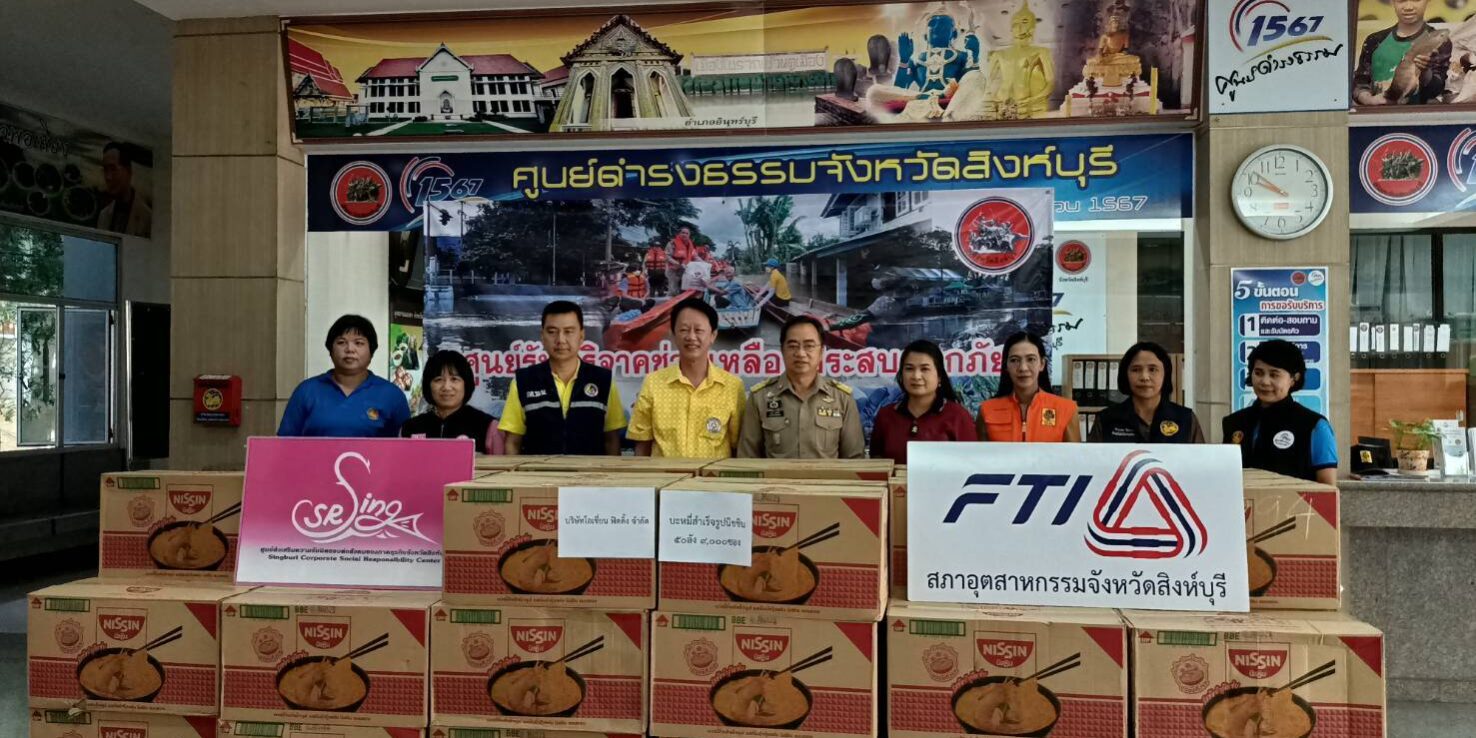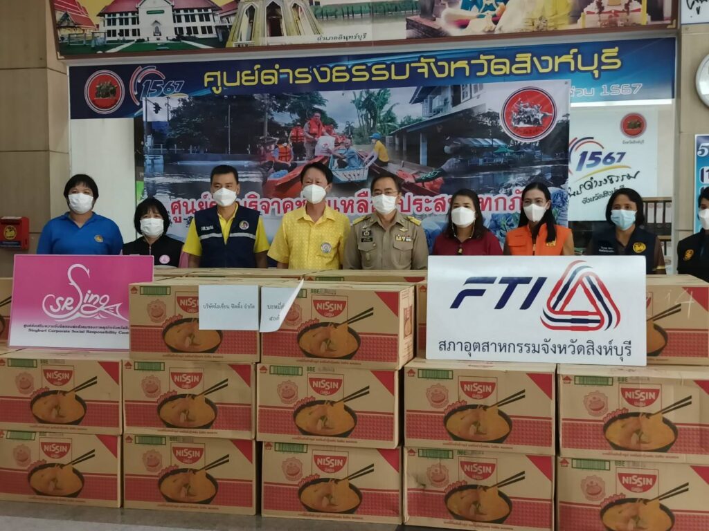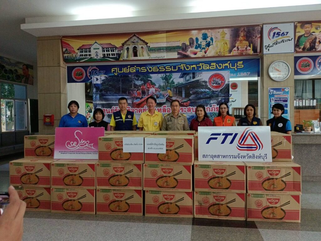 สิงห์บุรี-นายวิจิตร เลิศไพบูลย์วงศ์ ประธานสภาอุตสาหกรรมจังหวัดสิงห์บุรีและนางอรพรรณ รักถนอม นายกสโมสรโรตารีสิงห์บุรีวีรชน มอบบะหมี่กึ่งสำเร็จรูป นิสชิน จำนวน 50 ลัง (9000 ซอง) มูลค่ากว่า 50,000 บาท ในนามบริษัท โอเชี่ยนฟิตติ้ง จำกัด ให้กับจังหวัดสิงห์บุรี เพื่อแจกจ่ายให้กับผู้ประสบอุทกภัยน้ำท่วมในพื้นที่จังหวัดสิงห์บุรี โดยมี นายสุพจน์ ยศสิงห์คำ ผู้ว่าราชการจังหวัดสิงห์บุรี พร้อมหัวหน้าส่วนราชการ รับมอบ ณ บริเวณห้องโถง ศาลากลางจังหวัดสิงห์บุรี
