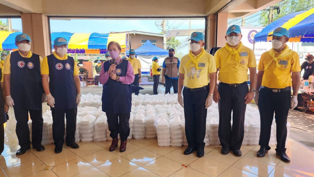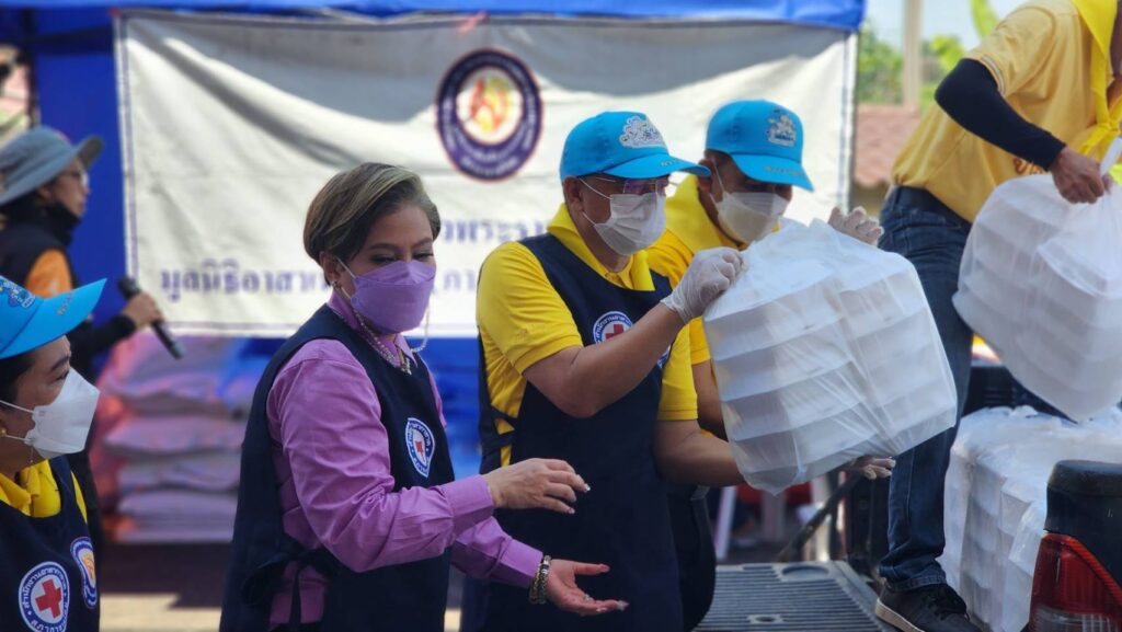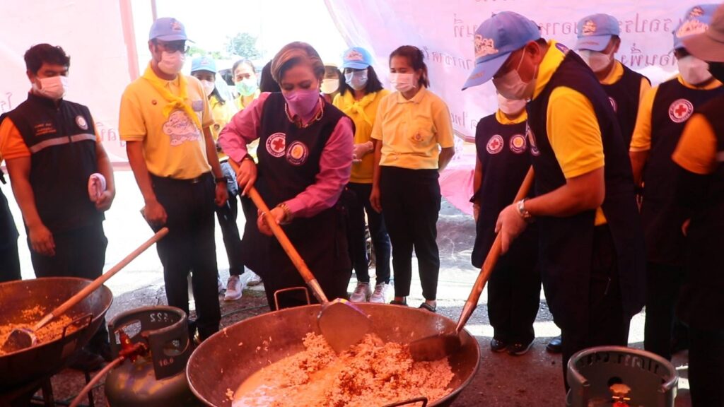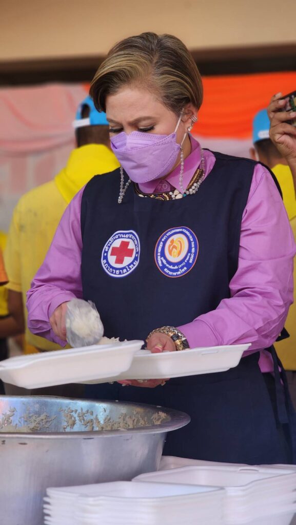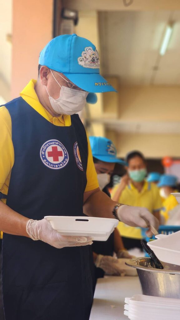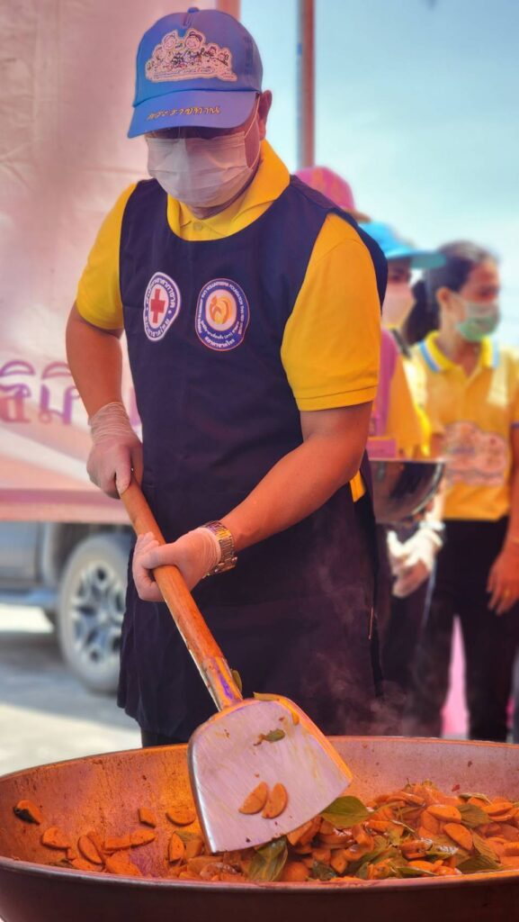 มูลนิธิอาสาเพื่อนพึ่ง (ภาฯ) ยามยาก สภากาชาดไทย ให้การสนับสนุนรถประกอบอาหาร พร้อมบุคลากรปฏิบัติหน้าที่ในการประกอบอาหารเพื่อแจกจ่ายให้กับประชาชนที่ประสบอุทกภัยในพื้นที่ตำบลทับยา ตำบลประศุก ตำบลอินทร์บุรี ตำบลท่างาม ตำบลชีน้ำร้าย อำเภออินทร์บุรี ตำบลวิหารขาว อำเภอท่าช้าง จังหวัดสิงห์บุรี ซึ่งดำเนินการระหว่างวันที่ 12 – 16 ตุลาคม 2565 วันนี้ดำเนินการวันที่ 2 ประกอบด้วยเมนู ข้าวสวย ผัดพริกเผาหมูยอ+ไข่ต้มและข้าวสวยผัดกระเพราไก่+ไข่ต้ม รวมทั้งสิ้น 12,500 กล่อง