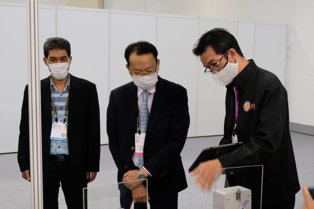 2.ผลงาน “หน้ากากผ้าแสดงผลผู้สวมใส่ที่มีอุณหภูมิสูงด้วยการเปลี่ยนสีของสารเทอร์โมโครมิก” โดย ดร.นารีรัตน์ จริยะปัญญา และคณะ แห่งคณะวิศวกรรมศาสตร์ มหาวิทยาลัยเทคโนโลยีราชมงคลธัญบุรี