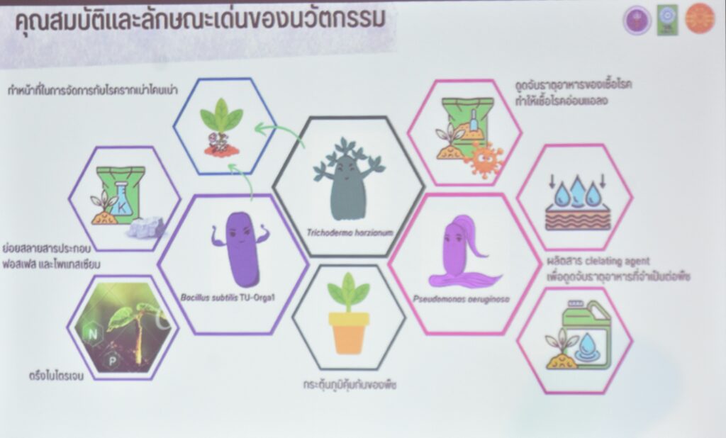 รศ.ดร.ดุสิต อธินุวัฒน์ และคณะ เปิดเผยว่า การเผาฟางและตอซังข้าว ก่อให้เกิดมลพิษปล่อยขึ้นสู่บรรยากาศ โดยเฉพาะฝุ่นละอองขนาดเล็ก PM 2.5 และส่งผลกระทบต่อการเปลี่ยนแปลง สมบัติของดินทั้งทางด้านกายภาพ เคมี ชีวภาพ เนื่องจากความร้อนจากการเผาฟางและตอซังข้าว จากปัญหาดังกล่าวจึงเกิดความคิดที่จะพัฒนาผลิตปุ๋ยเม็ดรักษ์โลกด้วยนวัตกรรม 3P ปุ๋ยคอกอัดเม็ดผสมจุลินทรีย์ที่มีประโยชน์ ประกอบด้วย ฟางข้าว nanocellulose และจุลินทรีย์ที่มีประโยชน์ 3 สายพันธุ์ ได้แก่ Bacillus subtilis TU-Orga1,Pseudomonas aeruginosa และ Trichoderma harzianum พร้อมเติมธาตุอาหารเสริมประสิทธิภาพต่างๆ รวมอยู่ใน 3P ปุ๋ยคอกอัดเม็ดผสมจุลินทรีย์ที่มีประโยชน์ โดยมีการทดสอบประสิทธิภาพของ 3P ปุ๋ยคอกอัดเม็ดในพืชต่างๆ เช่น ทุเรียน ส้มโอ และพริก พบว่าพืชให้ผลผลิตในปริมาณที่เพิ่มขึ้น ซึ่งผลิตภัณฑ์ปุ๋ยคอกจะอยู่ในรูปแบบอัดเม็ดแห้ง เมื่อพืชที่ใส่ปุ๋ย 3P ปุ๋ยคอกอัดเม็ดผสมจุลินทรีย์ได้รับน้ำจะเกิดการกระตุ้นและส่งเสริมการเจริญเติบโต พืชจะได้รับธาตุอาหารจากปุ๋ยคอกและจุลินทรีย์ที่มีคุณสมบัติเพิ่มธาตุอาหาร และกระตุ้นภูมิคุ้มกันของพืช ทำให้พืชเกิดความต้านทานต่อโรคได้อย่างมีประสิทธิภาพ ป้องกันโรครากเน่าโคนเน่า นำไปสู่