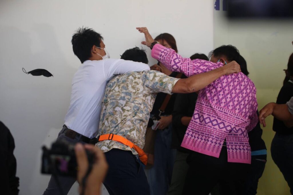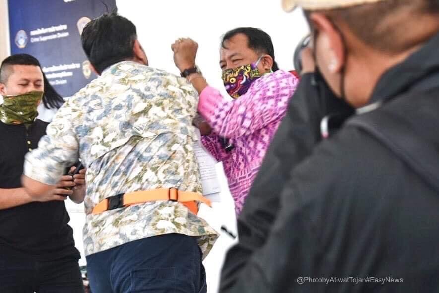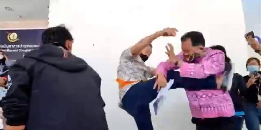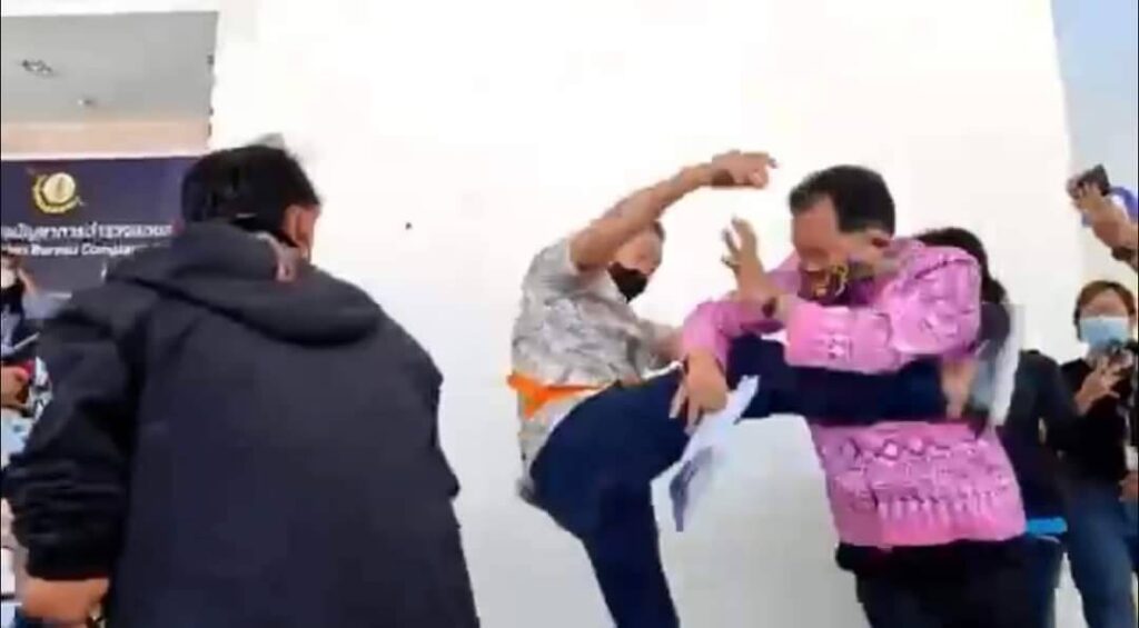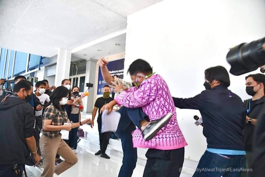 ผู้สื่อข่าวรายงานว่า ในระหว่างที่ นายศรีสุวรรณฯ กำลังยืนให้สัมภาษณ์กับสื่อมวลชนที่มาเฝ้าติดตามอยู่นั้น ได้มี นายวีรวิทย์ รุ่งเรืองศิริผล อายุ 62 ปี สมาชิกกลุ่มศักดินาเสื้อแดงต่อต้านเผด็จการ ที่มาไลฟ์รายงานข่าว ได้ทำท่าทีสอบถามประเด็นการร้องเรียนของนายศรีสุวรรณฯ ว่า หลังจากที่ศาลรัฐธรรมนูญ ตัดสินคดี 8 ปีนายกรัญมนตรี จะมีการแจ้งความคนเห็นต่างหรือไม่ แต่ยังไม่ทันจะถามจบนายวีรวิชญ์ฯ ก็ได้เข้าไปต่อยนายศรีสุวรรณฯ จนเกิดการชุลมุนนานร่วม 10 นาที ก่อนจะมีช่างภาพสื่อมวลชนที่อยู่ในเหตุการณ์ช่วยกันเข้าห้ามปรามแยกออกจากกัน