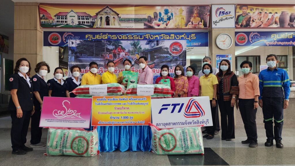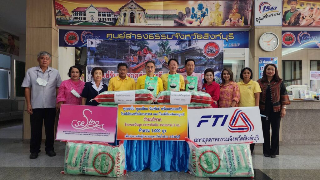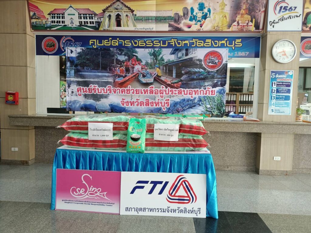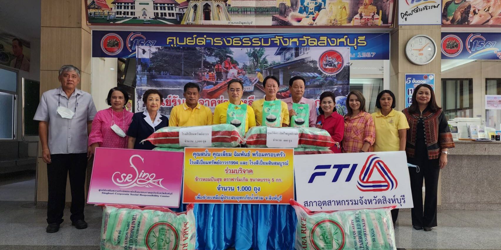 วันที่ 18 ตุลาคม 2565 นายสนั่น- นางเลียม ฉิมพันธ์ โรงสีเปลี่ยนทรัพย์ถาวร มอบข้าวสารจำนวน 1,000 ถุงๆละ 5 กก. รวม 5,000 กก.มูลค่าประมาณ 100,000 บาท และ นายวิจิตร เลิศไพบูลย์วงศ์ ประธานสภาอุตสาหกรรมจังหวัดสิงห์บุรี นางอรพรรณ รักถนอม นายกสโมสรโรตารีสิงห์บุรีวีรชน มอบข้าวสารเพิ่มเติมอีก 400ถุงรวม 2,000 กก. มูลค่าประมาณ 40,000 บาท ให้กับศูนย์บรรเทาทุกข์จังหวัดสิงห์บุรี เพื่อนำไปแจกให้กับผู้ประสบอุทกภัยน้ำท่วมในจังหวัดสิงห์บุรี โดยได้รับเกียรติจาก นายสุพจน์ ยศสิงห์คำ ผู้ว่าราชการจังหวัดสิงห์บุรี นายสมชาย ลีล้าน้อย รองผู้ว่าราชการจังหวัดสิงห์บุรี และหัวหน้าส่วนราชการร่วมรับมอบ ณ ศาลากลางจังหวัดสิงห์บุรี และส่งมอบให้กับเหล่ากาชาดจังหวัดสิงห์บุรีดำเนินการต่อไป