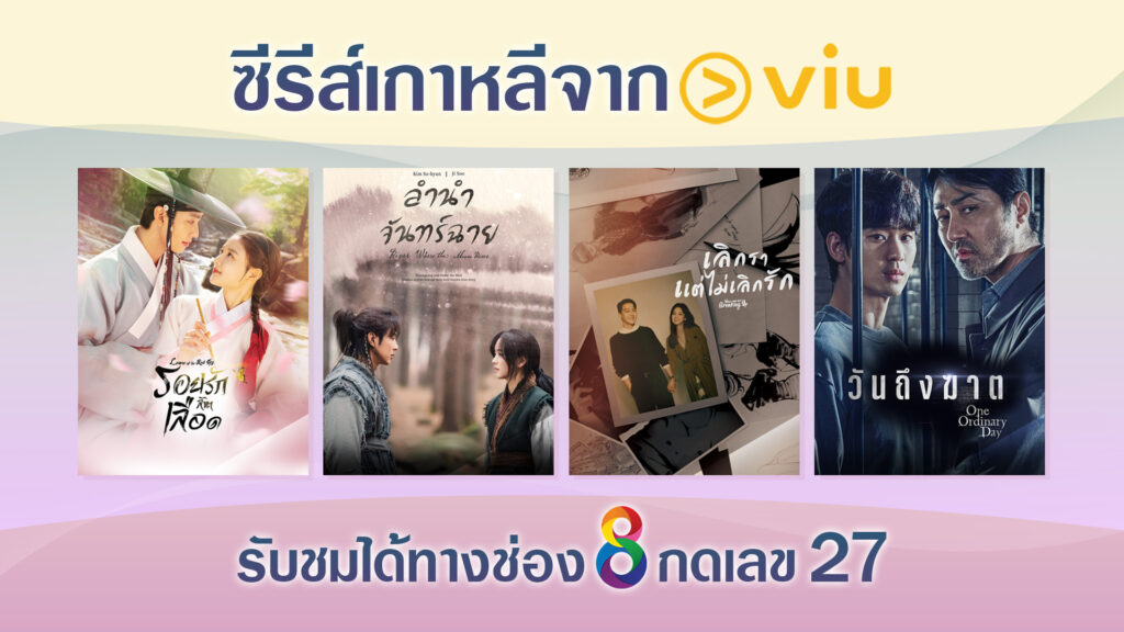 นอกจากความพิเศษของละครไทยชื่อดังที่คิดถึงกว่า 11 เรื่อง ได้รับชมกันแล้ว ทาง Viu ยังเล็งเห็นถึงความสำคัญ ของฐานผู้ชมคอนเทนต์บันเทิงที่โดดเด่นของทางสถานีโทรทัศน์ช่อง 8 และนับว่าเป็นพันธมิตรใหม่ ที่ร่วมมือกันครั้งแรก จึงขอมอบของขวัญสุดพิเศษส่งท้ายปี ให้กับแฟนๆ ด้วยการส่งซีรีส์เกาหลีเรื่องดัง อาทิ River Where the Moon Rises, Lovers of the Red Sky, Now, We are Breaking Up, One Ordinary Day ที่สร้างเรตติ้งถล่มทลายในหลายประเทศ โดยจะออกอากาศทุกวันเสาร์-อาทิตย์ ช่วงเวลา 14.45 น. ประเดิมด้วยเรื่อง Lovers of the Red Sky ลงจอให้ชมกันแล้ว บนหน้าจอช่อง 8!!
