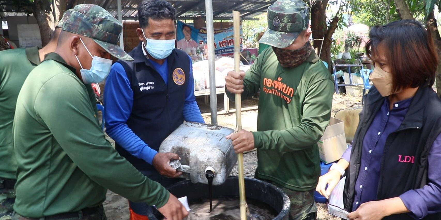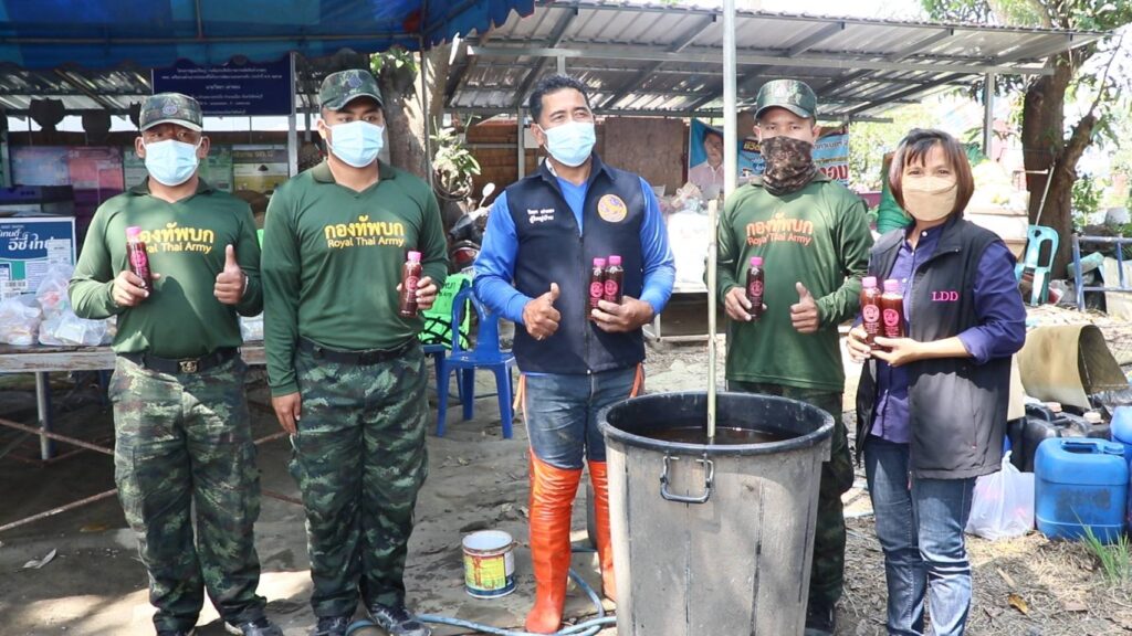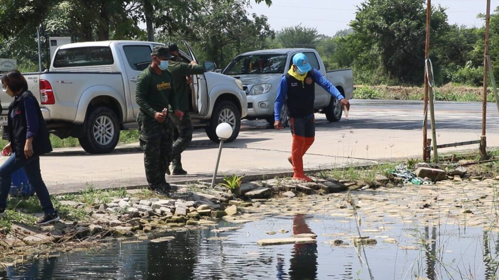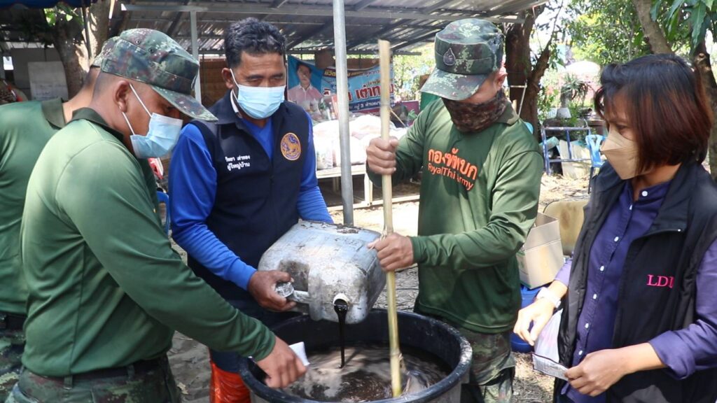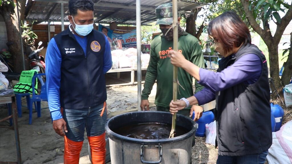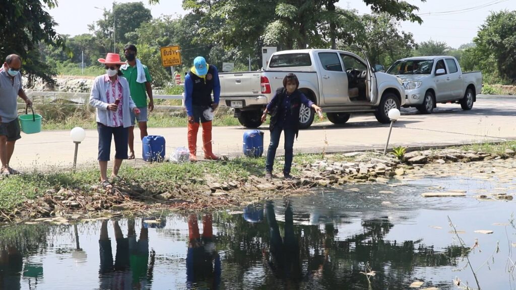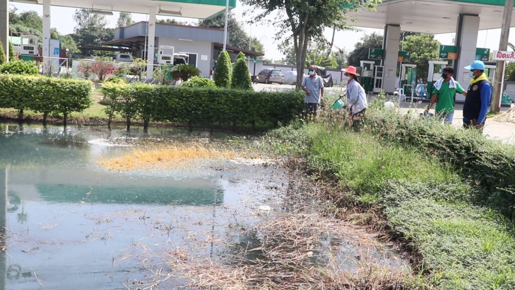 วันพุธที่ 20 ตุลาคม 2565 นางสาวชินภา ดวงศรี เจ้าหน้าที่การเกษตรปฏิบัติงานสถานีพัฒนาที่ดินสิงห์บุรี ลงพื้นที่ติดตามสถานการณ์และแก้ไขปัญหาน้ำเน่าเสียที่ท่วมขังมาเป็นเวลานาน ซึ่งเริ่มส่งกลิ่นเหม็นและเป็นแหล่งเพาะพันธุ์ของยุง ส่งผลกระทบต่อประชาชนในพื้นที่ หมู่ที่ 3 ตำบลบางกระบือ อำเภอเมือง จังหวัดสิงห์บุรี โดยสนับสนุนสารเร่งซุปเปอร์ พด.6 และสารบำบัดน้ำเสียและขจัดกลิ่นเหม็นที่ผลิตจากสารเร่งซุปเปอร์ พด.6 เพื่อบำบัดน้ำเสียและขจัดกลิ่นเหม็น พร้อมให้คำแนะนำและสาธิตวิธีการผลิตและการใช้สารบำบัดน้ำเสียฯ แก่ผู้นำท้องถิ่น นำโดยนายวิทยา เต่าทอง ผู้ใหญ่บ้านหมู่ 3 จัดตั้งศูนย์เรียนรู้ผลิตน้ำหมักชีวภาพนำไปถ่ายทอดแก้ไขปัญหาน้ำเน่าเสียให้ประชาชนได้นำสารบำบัดน้ำเสียและขจัดกลิ่นเหม็นที่ผลิตจากสารเร่งซุปเปอร์ พด.6 ไปเทลงบริเวณน้ำท่วมขัง เพื่อบำบัดน้ำเสียและขจัดกลิ่นเหม็นซึ่งเป็นแหล่งเพาะพันธุ์ของยุง พร้อมแจกจ่ายและให้ความรู้ในการบำบัดน้ำเสีย เพื่อบรรเทาความเดือดร้อนให้กับประชาชนผู้ประสบอุทกภัยและเกษตรกรในพื้นที่ตำบลบางกระบือ