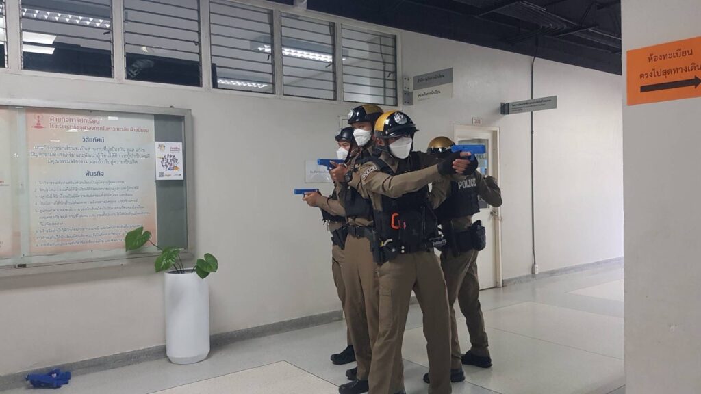 ทั้งนี้ พล.ต.อ.ต่อศักดิ์ สุขวิมล รองผบ.ตร. ให้สัมภาษณ์กับสื่อมวลชนว่า วันนี้เจ้าหน้าที่ตำรวจโดยสำนักงานตำรวจแห่งชาติ ได้มาให้ความรู้เรื่องการรับมือเหตุกราดยิงในสถานศึกษา ซึ่งเราทำเรื่องนี้มานานแล้ว แต่ยังไม่ทั่วถึง พอมีเหตุเกิดที่จังหวัดหนองบัวลำภู ก็ได้มีการถอดบทเรียนแล้วว่าการลดความสูญเสียได้มากที่สุดคือการให้ความรู้กับเหยื่อ เพราะเหตุการณ์แบบนี้สามารถเกิดขึ้นได้ทุกที่ ถ้าหากเหตุเกิดในโรงเรียนเด็กเล็กต้องทำอย่างไร หากเกิดเหตุในห้างสรรพสินค้าต้องทำอย่างไร ซึ่ง รปภ.ต้องรู้วิธีการับมือ ซึ่งก็ได้ประสานการดำเนินงานกับบริษัท รปภ. ให้มีการฝึกอบรมและออกใบอนุญาตเกี่ยวกับกิจการรักษาความปลอดภัยโดยตำรวจ