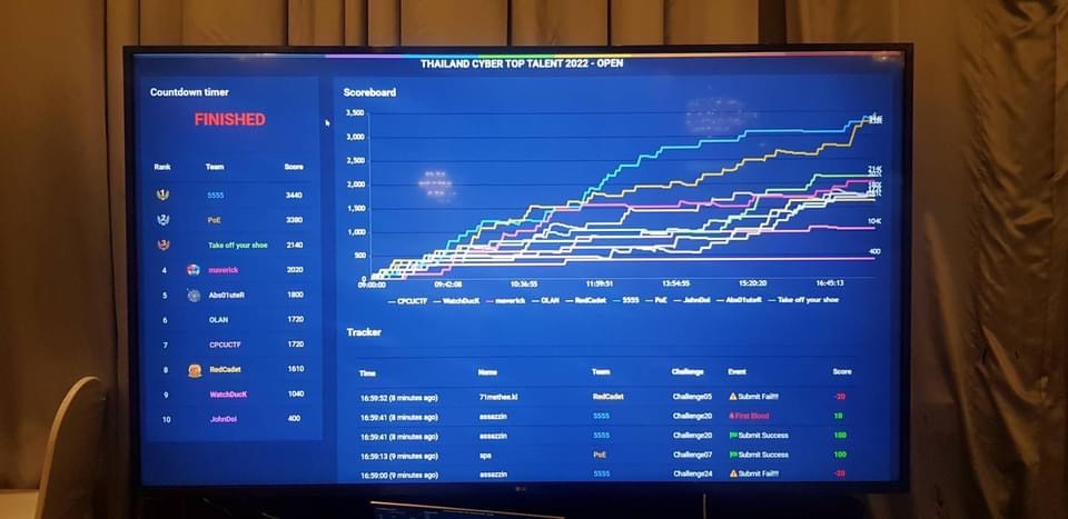 โฆษก ตร. เผยด้วยว่า ทีม blueberry จากมหาวิทยาลัยเกษตรศาสตร์ ได้อันดับที่ 2 ทำคะแนนได้ 1,900 คะแนน ทีม RedCheep จากมหาวิทยาลัยเทคโนโลยีพระจอมเกล้าธนบุรี ได้อันดับที่ 3 ทำคะแนนได้ 1,870 คะแนน ทีม Chicken Field จากจุฬาลงกรณ์มหาวิทยาลัย ได้อันดับที่ 4 ทำคะแนนได้ 1,590 คะแนน และ ทีม 4ucky จากสถาบันเทคโนโลยีพระจอมเกล้าเจ้าคุณทหารลาดกระบัง ได้อันดับที่ 5 ทำคะแนนได้ 1,380 คะแนน โดยทีม Rebooster จาก รร.นรต. จะเป็นผู้แทนประเทศไทยไปแข่งขันในรายการ Cyber SEA Game 2022 หรือ การแข่งขันด้านความมั่นคงปลอดภัยทางไซเบอร์ ในระดับอาเซียน ที่ประเทศญี่ปุ่น ต่อไป