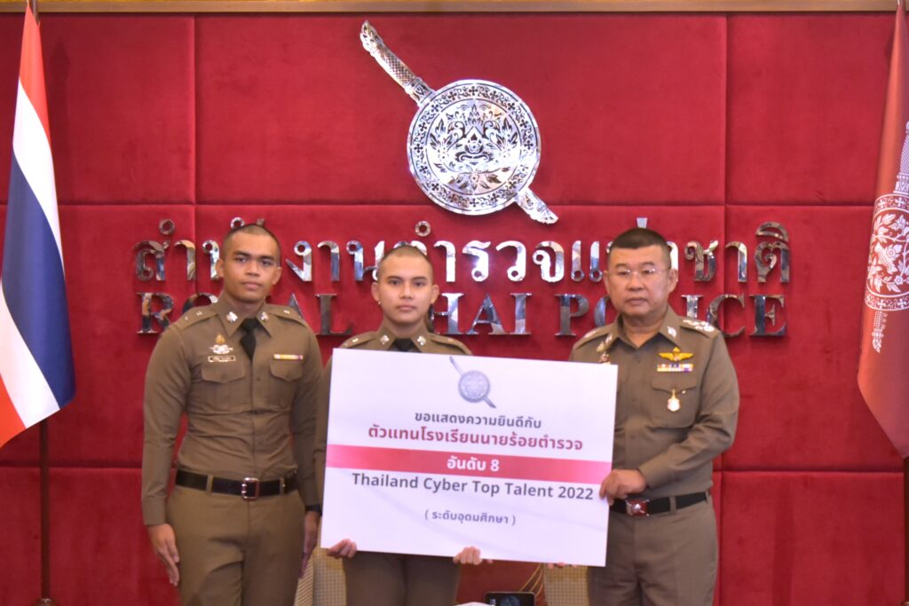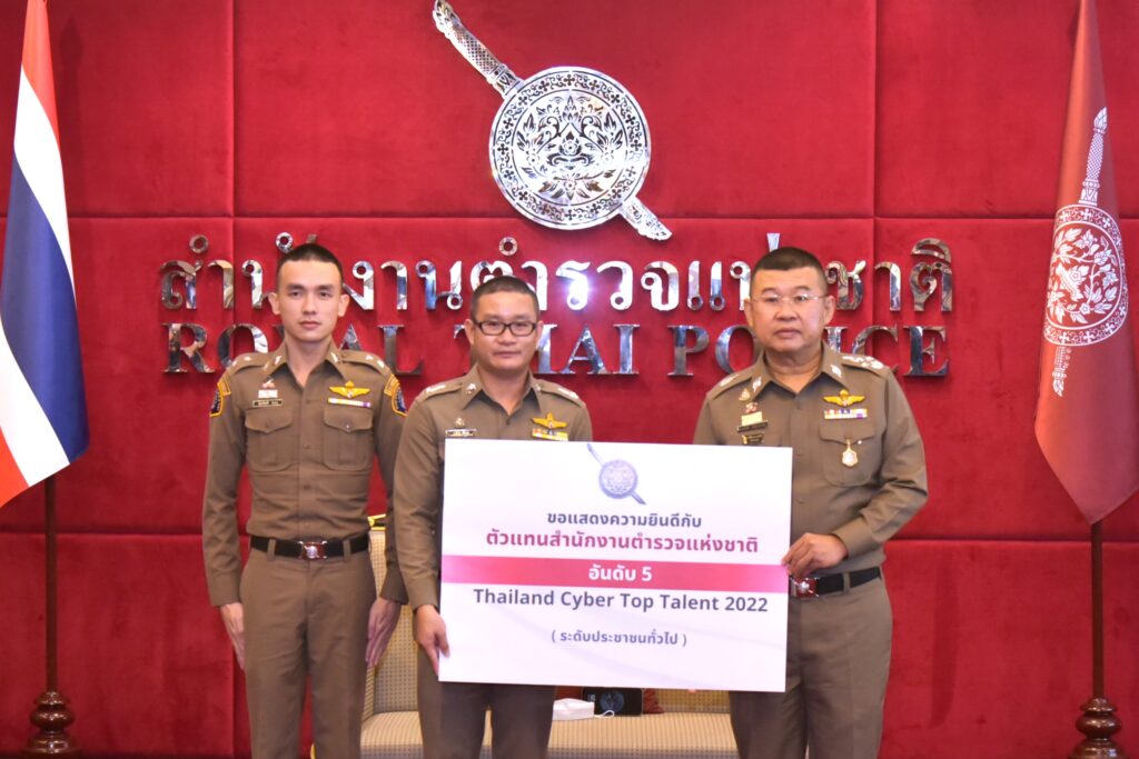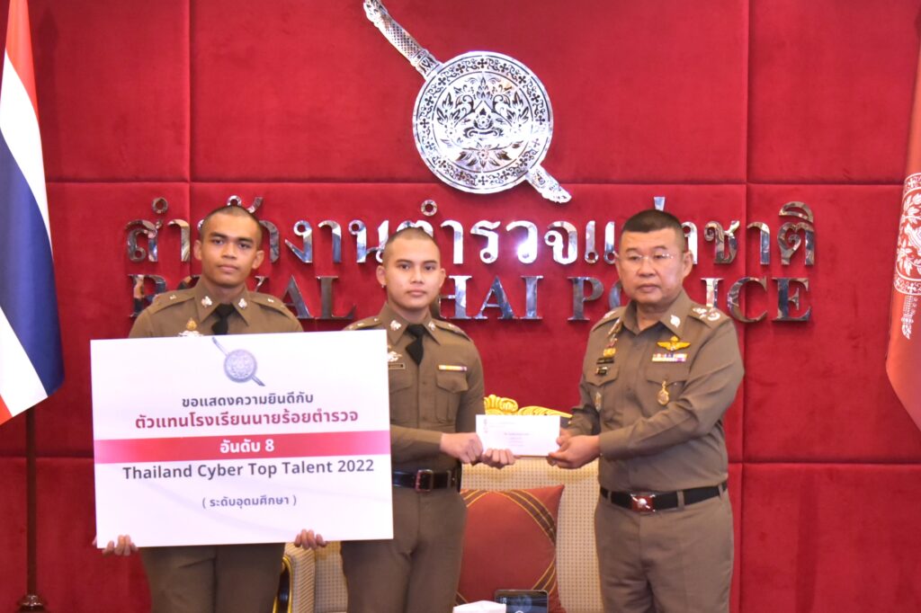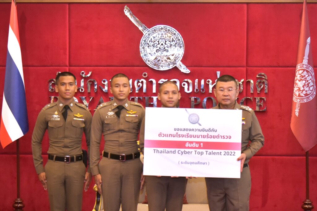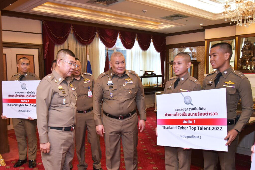 วันที่ 25 ตุลาคม 2565 เวลา 11.00 น. ที่สํานักงานตํารวจแห่งชาติ : พล.ต.อ.ดำรงศักดิ์ กิตติประภัสร์ ผบ.ตร. แสดงความยินดี และมอบรางวัลแก่ “นักเรียนนายร้อยตำรวจ” ที่ได้รับรางวัลชนะเลิศ Thailand Cyber Top Talent 2022 การแข่งขันด้านความมั่นคงปลอดภัยไซเบอร์ระดับประเทศ