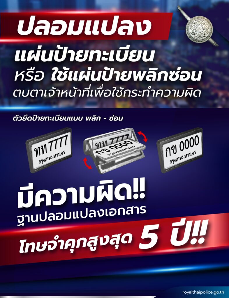 โฆษก ตร.กล่าวเพิ่มเติมว่า ขอเตือนไปยังพี่น้องประชาชน การแก้ไขเปลี่ยนแปลงทะเบียนรถ โดยการปลอมขึ้นทั้งแผ่น หรือ แก้ไขตัวเลขส่วนหนึ่งส่วนใด มีความผิดตามประมวลกฎหมายอาญามาตรา 264,265 มีโทษจำคุกตั้งแต่ 6 เดือนถึง 5 ปี ปรับตั้งแต่หนึ่งหมื่นบาทถึงหนึ่งแสนบาท แม้กระทั่งการใช้ป้ายทะเบียนคันอื่น ใช้แผ่นป้ายทะเบียนที่ถูกเพิกถอนแล้ว ก็เป็นความผิด ส่วนคนที่ขายอุปกรณ์ดังกล่าวอาจจะเข้าข่ายสนับสนุนการกระทำความผิด หากถูกนำไปใช้ทำผิดกฎหมาย