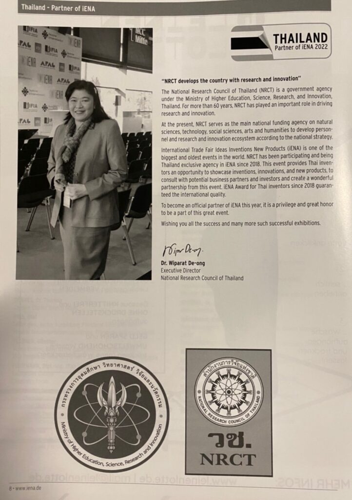 iENA เป็นงานประกวดสิ่งประดิษฐ์และนวัตกรรมระดับนานาชาติที่สำคัญในสหภาพยุโรป ในแต่ละปีมีผลงานเข้าร่วมจัดแสดงมากกว่า 500 ผลงาน และมีประเทศต่างๆจากภูมิภาคยุโรปและเอเชีย เข้าร่วมนำเสนอและประกวดผลงาน ในปี 2022 ประเทศไทย ได้รับเกียรติจาก AFAG Messen und Ausstellungen GmbH เชิญ (วช.) ร่วมเป็น partner ของการจัดงาน iENA ในฐานะหน่วยงานหลักของไทยที่ได้รับมอบหมายจาก AFAG Messen und Ausstellungen GmbH ในการนำผลงานเข้าร่วมประกวดและจัดแสดงนิทรรศการ โดย ดร.วิภารัตน์ ดีอ่อง ผู้อำนวยการสำนักงานการวิจัยแห่งชาติ ได้ร่วมกล่าวถึงบทบาทของ (วช.) ภายใต้กระทรวงการอุดมศึกษา วิทยาศาสตร์ วิจัยและนวัตกรรม (อว.) ในการส่งเสริมและสนับสนุนการนำผลงานสิ่งประดิษฐ์และนวัตกรรมของไทยร่วมประกวดและจัดแสดงในเวทีนานาชาติ
