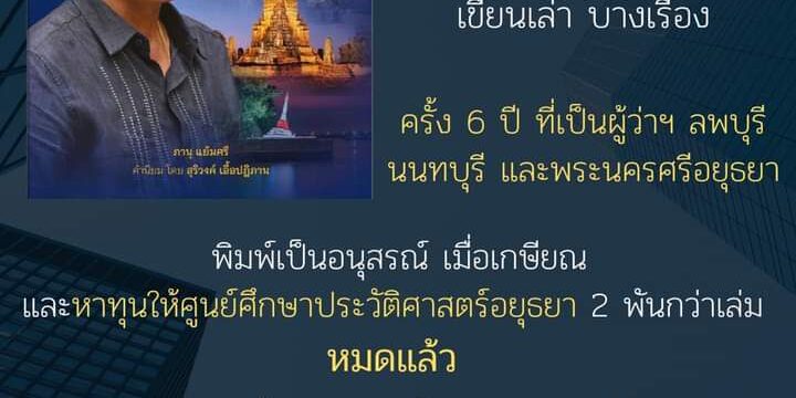 เขียนเล่า โดย อดีตผู้ว่าฯ ท่านภานุ แย้มศรี ในระยะ 6 ปี ที่เป็นผู้ว่าฯ ลพบุรี นนทบุรี และพระนครศรีอยุธยา จัดตีพิมพ์เพื่อเป็นอนุสรณ์เมื่อครั้งเกษียณอายุราชการ ปี 2564 และเพื่อหาทุนให้ศูนย์ศึกษาประวัติศาสตร์อยุธยา จำนวน 2,000 เล่ม