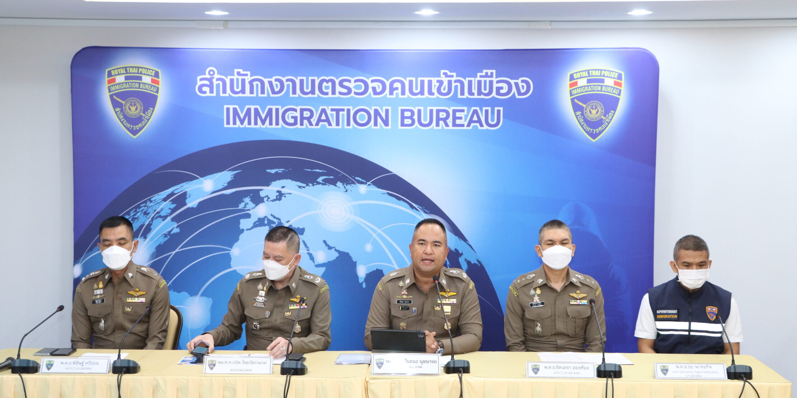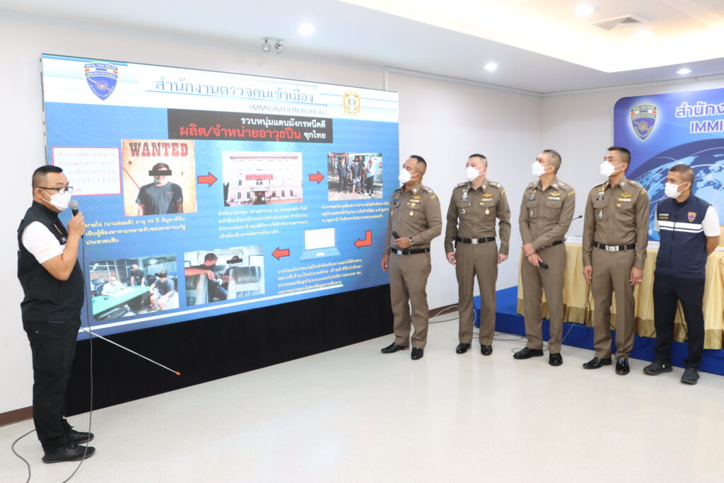 วันที่ 27 ต.ค.65 เวลา 10.30 น. ณ ห้องแถลงข่าว ชั้น 2 สำนักงานตรวจคนเข้าเมือง อาคารเฉลิมพระเกียรติสมเด็จพระบรมโอรสาธิราชฯ สยามมกุฎราชกุมาร พระชนมพรรษา 60 พรรษา ต.บ้านใหม่ อ.ปากเกร็ด จ.นนทบุรี : พล.ต.ท.ภาคภูมิภิภัทฒ์ สัจจพันธุ์ ผบช.สตม. มอบหมายให้ พล.ต.ต.พันธนะ นุชนารถ รอง ผบช.สตม.,พล.ต.ต.ธนิต ไทยวัชรามาศ ผบก.สส.สตม.,พ.ต.อ.รัฐโชติ โชติคุณ รอง ผบก.สส.สตม.,พ.ต.อ.อาภากรโกมลสุทธิ รอง ผบก.สส.สตม.,พ.ต.อ.ชิตเดชา สองห้อง ผกก.1 บก.สส.สตม.,พ.ต.อ.พิสิษฐ์ ศรีอ่อน ผกก.2 บก.สส.สตม. และ พ.ต.อ.ชย พาหะกิจ ผกก.(สอบสวน)กลุ่มงานสอบสวน บก.สส.สตม. ร่วมแถลงข่าวการจับกุมผู้ต้องหารายสำคัญ จำนวน 4 คดี ดังนี้