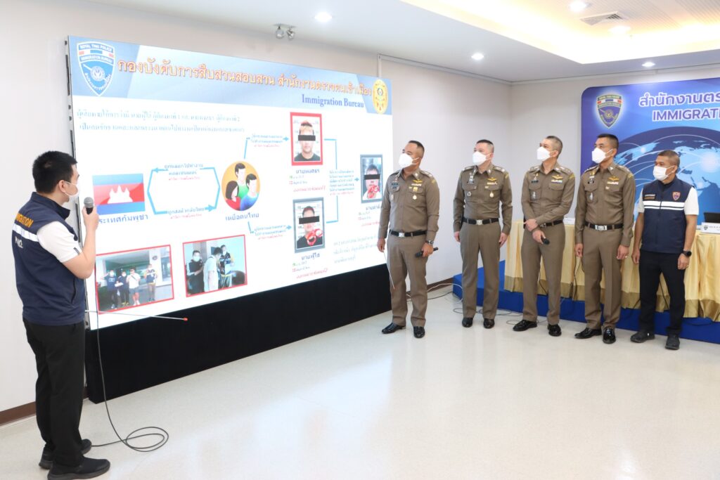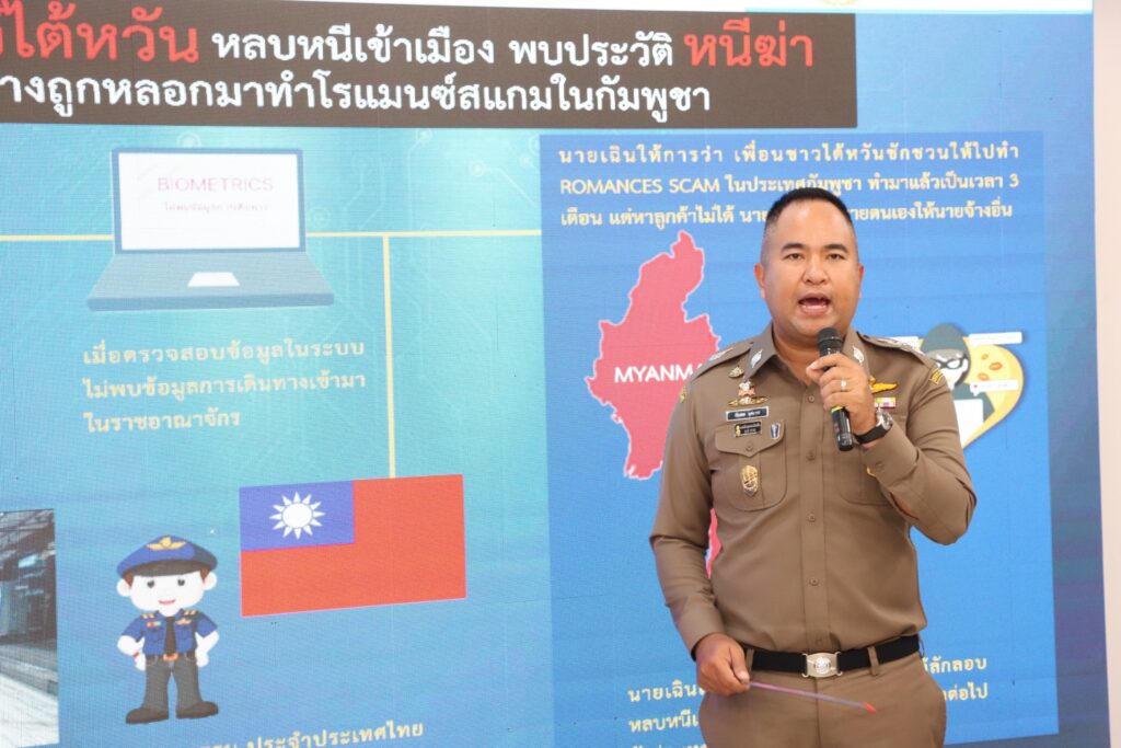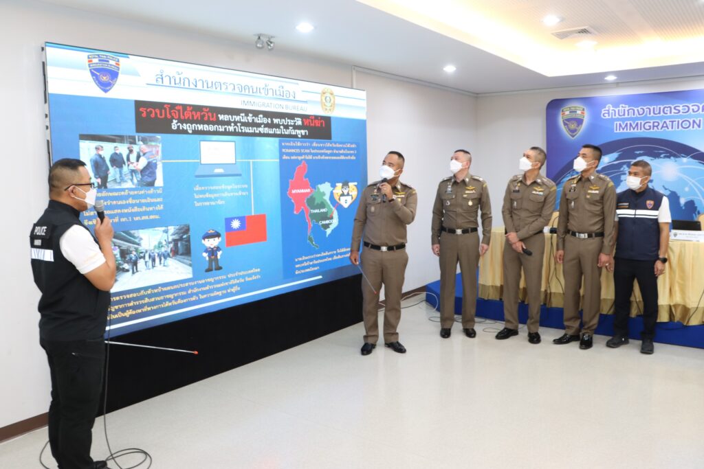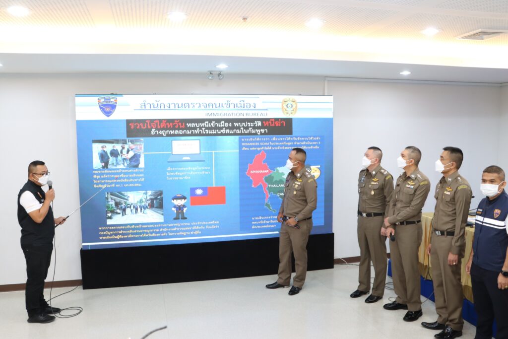 คดีที่ 4.รวบโจ๋ไต้หวัน หลบหนีเข้าเมือง พบประวัติหนีคดีฆ่า อ้างถูกหลอกมาทำโรแมนซ์สแกมในกัมพูชา : เจ้าหน้าที่ตำรวจ กก.1 บก.สส.สตม. จับกุมนายเฉิน (นามสมมติ) อายุ 17 ปี สัญชาติไต้หวัน โดยกล่าวหาว่า “เป็นคนต่างด้าวเดินทางเข้ามาและอยู่ในราชอาณาจักรโดยไม่ได้รับอนุญาต” เนื่องจากไม่มีหนังสือเดินทางแสดง และเมื่อตรวจสอบข้อมูลในระบบเทคโนโลยีสารสนเทศ ตม. ผลการตรวจสอบไม่พบข้อมูลการเดินทางเข้ามาในราชอาณาจักรแต่อย่างใด จากการสอบถามผู้ต้องหาให้การว่าตนเองได้ถูกเพื่อนชาวไต้หวันชักชวนให้ไปทำ Romancs scam ในประเทศกัมพูชา โดยทำมาแล้วเป็นเวลา 3 เดือน แต่หาลูกค้าไม่ได้ ทางนายจ้างจึงจะขายตนเองให้กับนายจ้างอื่น ตนเองเกรงว่าจะเกิดอันตราย จึงได้หลบหนีนายจ้างและลักลอบหลบหนีเข้ามาในประเทศไทยทางช่องทางธรรมชาติไม่ทราบว่าในพื้นที่จังหวัดใด เมื่อวันที่ 29 ก.ค.65 เพื่อต้องการจะเดินทางต่อไปยังประเทศเมียนมา และจากการตรวจสอบกับหัวหน้าแผนกประสานงานอาชญากรรม ประจำประเทศไทย กองบัญชาการตำรวจสืบสวนอาชญากรรม สำนักงานตำรวจแห่งชาติไต้หวัน แจ้งว่า นายเฉิน เป็นผู้ต้องหาที่ทางการไต้หวันต้องการตัวโดยในช่วงกลางปี พ.ศ.2564 ได้ร่วมกับพวกรวม 15 คน รุมทำร้ายผู้เสียหายเพื่อนร่วมชาติ โดยนายเฉินใช้ไม้ตีผู้เสียหายจนถึงแก่ความตาย ทางการไต้หวันจึงได้ออกหมายจับในความผิดฐานฆ่าผู้อื่น เจ้าหน้าที่ชุดจับกุมจึงได้แจ้งข้อกล่าวหาและนำตัวส่งพนักงานสอบสวนดำเนินคดีตามกฎหมายต่อไป