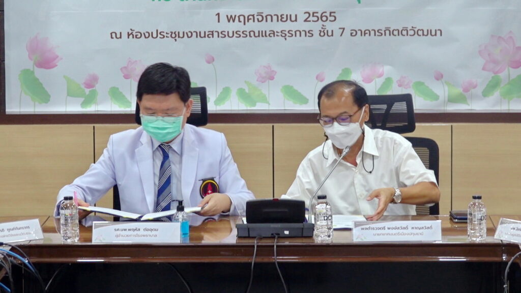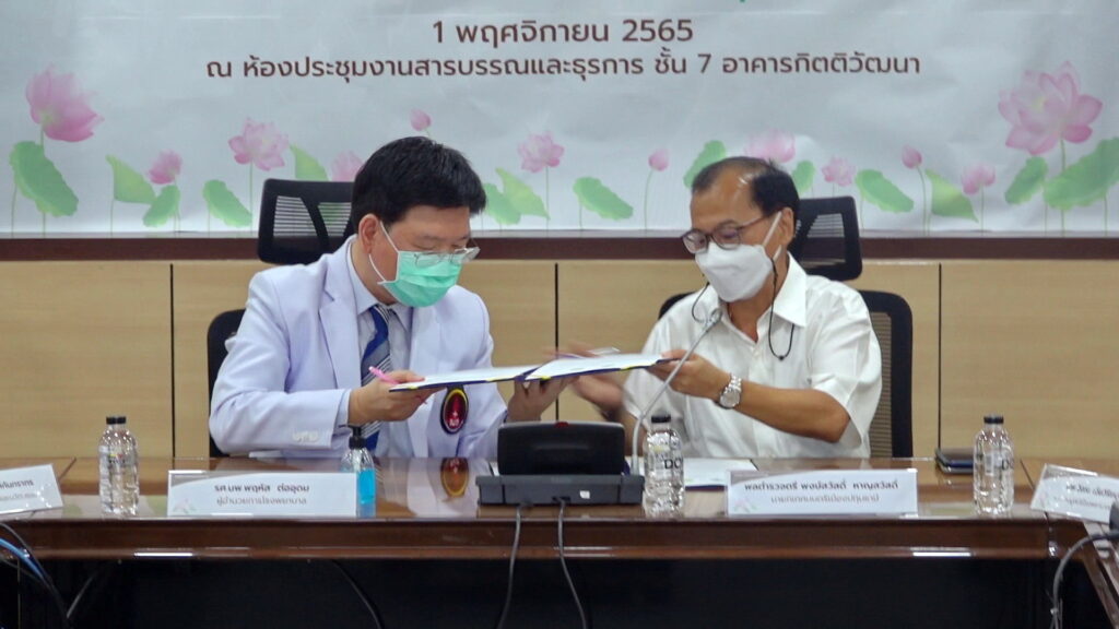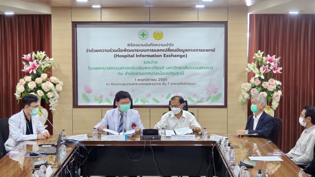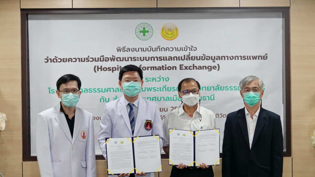 เมื่อเวลา 10.00 น. วันที่ 1 พฤศจิกายน 2565 ที่โรงพยาบาลธรรมศาสตร์เฉลิมพระเกียรติ ตำบลคลองหนึ่ง อำเภอคลองหลวง จังหวัดปทุมธานี รศ.นพ.พฤหัส ต่ออุดม ผู้อำนวยการโรงพยาบาลธรรมศาสตร์เฉลิมพระเกียรติ , ศ.นพ.ก้องเกียรติ กูณฑ์กันทรากร ผู้ช่วยผู้อำนวยการฝ่ายวิจัยและนวัตกรรม , พล.ต.ต.พงษ์สวัสดิ์ หาญสวัสดิ์ นายกเทศมนตรีเมืองปทุมธานี และ นพ.อิสระ เจียวิริยบุญญา ประธานมูลนิธิโรงพยาบาลมะเร็งอุดรธานี ร่วมลงนามบันทึกความเข้าใจว่าด้วยความร่วมมือพัฒนาระบบการแลกเปลี่ยนข้อมูลทางการแพทย์ (HIE : Hospital Information Exchange) ระหว่างโรงพยาบาลธรรมศาสตร์เฉลิมพระเกียรติ มหาวิทยาลัยธรรมศาสตร์ กับสำนักงานเทศบาลเมืองปทุมธานี เพื่อให้ประชาชนในเขตพื้นที่เทศบาลเมืองปทุมธานี สามารถใช้บริการทางการแพทย์ดิจิทัลได้อย่างถูกต้องและปลอดภัย
