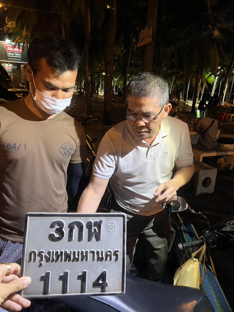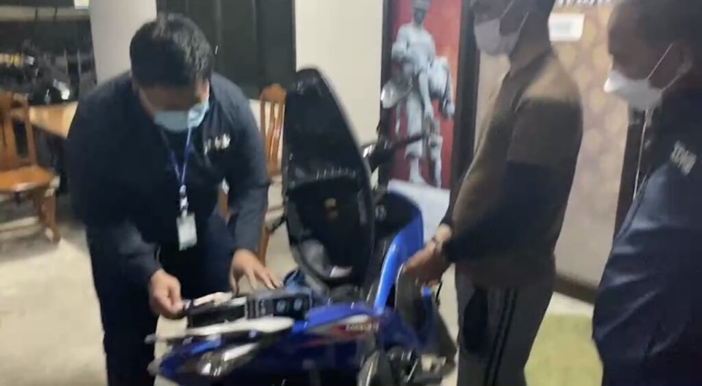 ต่อมาพบนายเกียรติศักดิ์ฯ เดินมายังจุดที่รถจักรยานยนต์จอดอยู่และกำลังจะขับขี่รถจักรยานยนต์ออกไป เจ้าหน้าที่ตำรวจชุดจับกุมจึงแสดงตนและขอตรวจสอบปรากฎพบแผ่นป้ายทะเบียนอยู่บริเวณใต้เบาะรถ ซึ่งตรงกับรถจักรยานยนต์ที่ได้แจ้งความไว้ จึงได้แจ้งสิทธิ์และข้อกล่าวหาในความผิดฐาน “ลักทรัพย์หรือรับของโจร” ให้ นายเกียรติศักดิ์ฯ รับทราบแล้ว