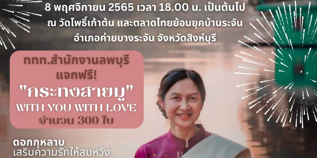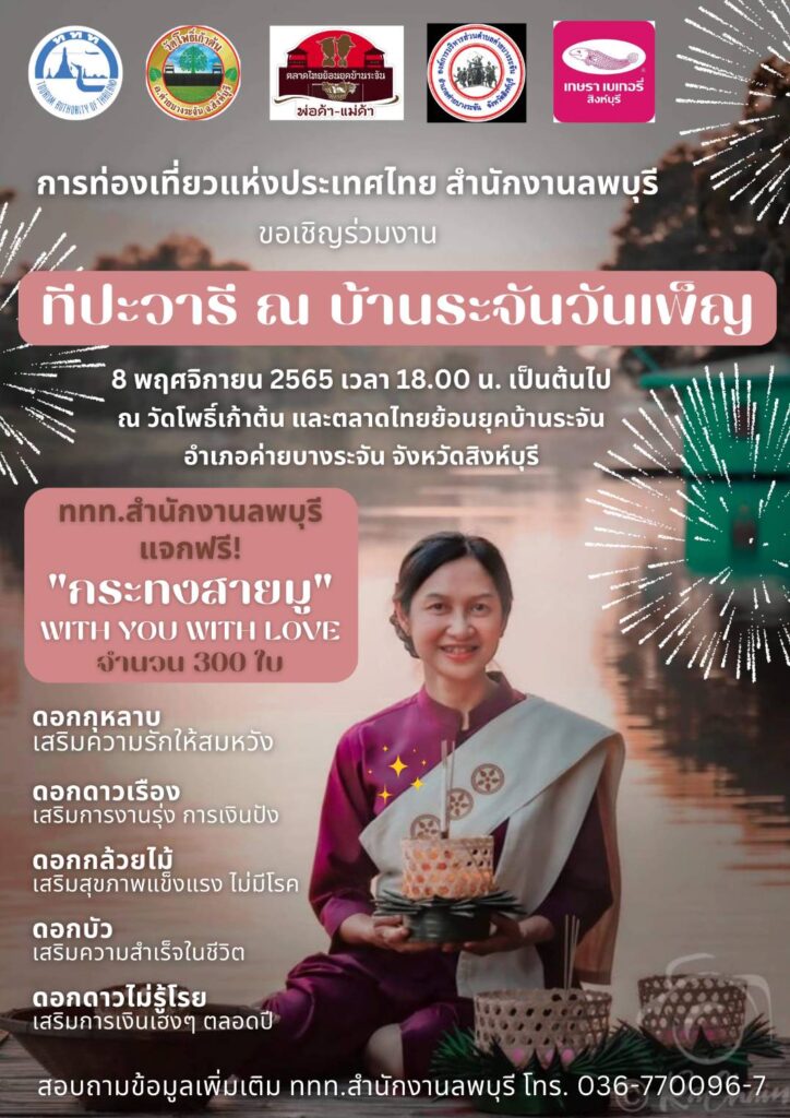 การท่องเที่ยวแห่งประเทศไทย (ททท.) สำนักงานลพบุรี ขอเชิญร่วมงาน “ทีปะวารี ณ บ้านระจันวันเพ็ญ” ตอน… สายน้ำแห่งชีวิตสถิตในดวงใจ ในวันอังคารที่ 8 พฤศจิกายน 2565 ณ บริเวณชายน้ำคลองบ้านระจัน ตลาดไทยย้อนยุคบ้านระจัน อำเภอค่ายบางระจัน จังหวัดสิงห์บุรี