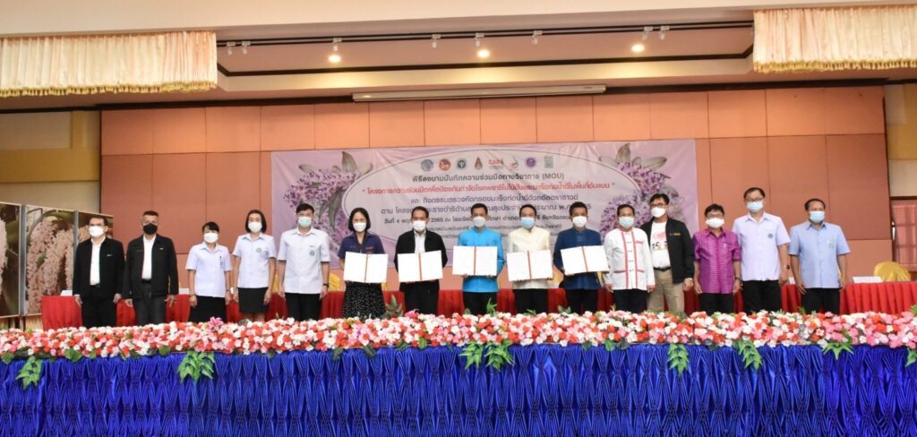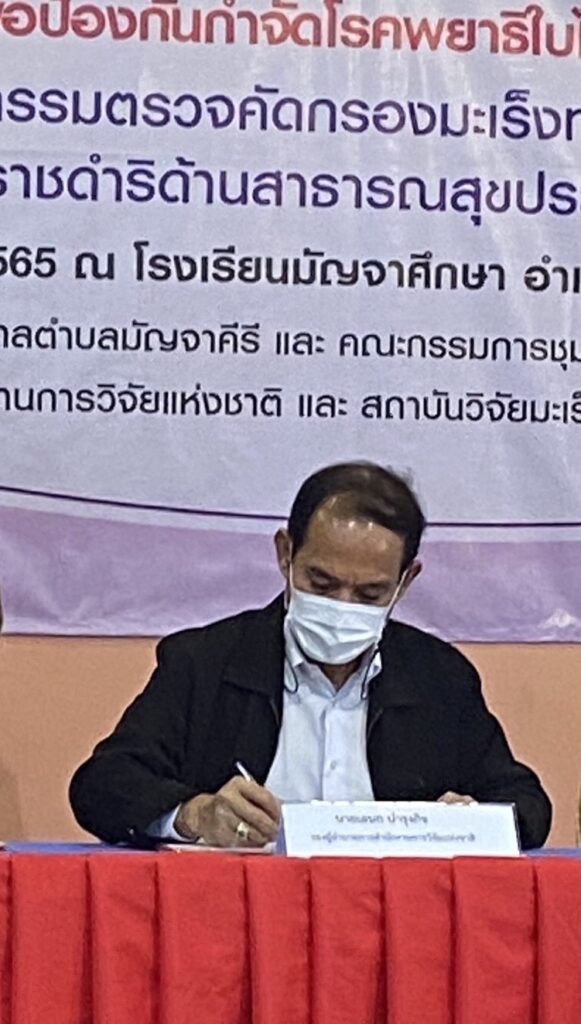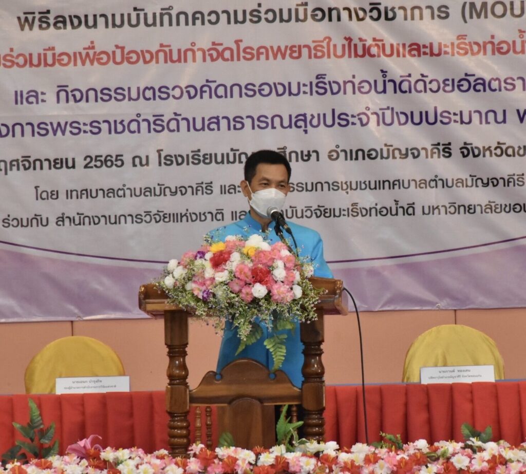 เมื่อวันที่ 4 พฤศจิกายน 2565 : ดร.วิภารัตน์ ดีอ่อง ผู้อำนวยการสำนักงานการวิจัยแห่งชาติ (วช.) ได้มอบหมายให้ นายเอนก บำรุงกิจ รองผู้อำนวยการสำนักงานการวิจัยแห่งชาติ (วช.) เข้าร่วมพิธีลงนามความร่วมมือทางวิชาการ และกิจกรรมตรวจคัดกรองมะเร็งท่อน้ำดีด้วยอัลตราซาวด์ตามโครงการตรวจคัดกรองโรคพยาธิใบไม้ตับและมะเร็งท่อน้ำดี และ โครงการความร่วมมือเพื่อป้องกันกำจัดโรคพยาธิใบไม้ตับและมะเร็งท่อน้ำดีในพื้นที่ต้นแบบ ซึ่งเป็นความร่วมมือระหว่างสำนักงานการวิจัยแห่งชาติ และ สถาบันวิจัยมะเร็งท่อน้ำดี มหาวิทยาลัยขอนแก่นร่วมกับเทศบาลตำบลมัญจาคีรี และคณะกรรมการชุมชนเทศบาลตำบลมัญจาคีรี จังหวัดขอนแก่น