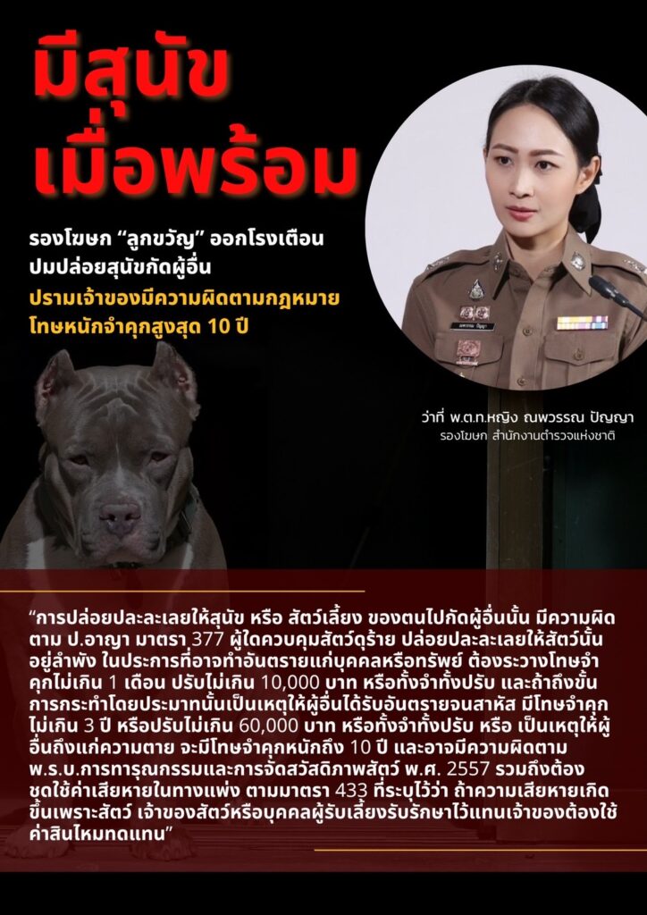 วันที่ 5 พ.ย.65 เวลา 08.00 น. ที่สำนักงานตำรวจแห่งชาติ (ตร.) ว่าที่ พ.ต.ท.หญิง ณพวรรณ ปัญญา รองโฆษก ตร. เปิดเผย ถึงกรณีที่มีข่าวสุนัขสายพันธุ์ “พิตบูล” ไล่กัดคนได้รับบาดเจ็บ เหตุจากเจ้าของปล่อยปละละเลยมีโทษทั้งแพ่งและอาญา