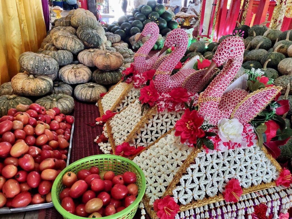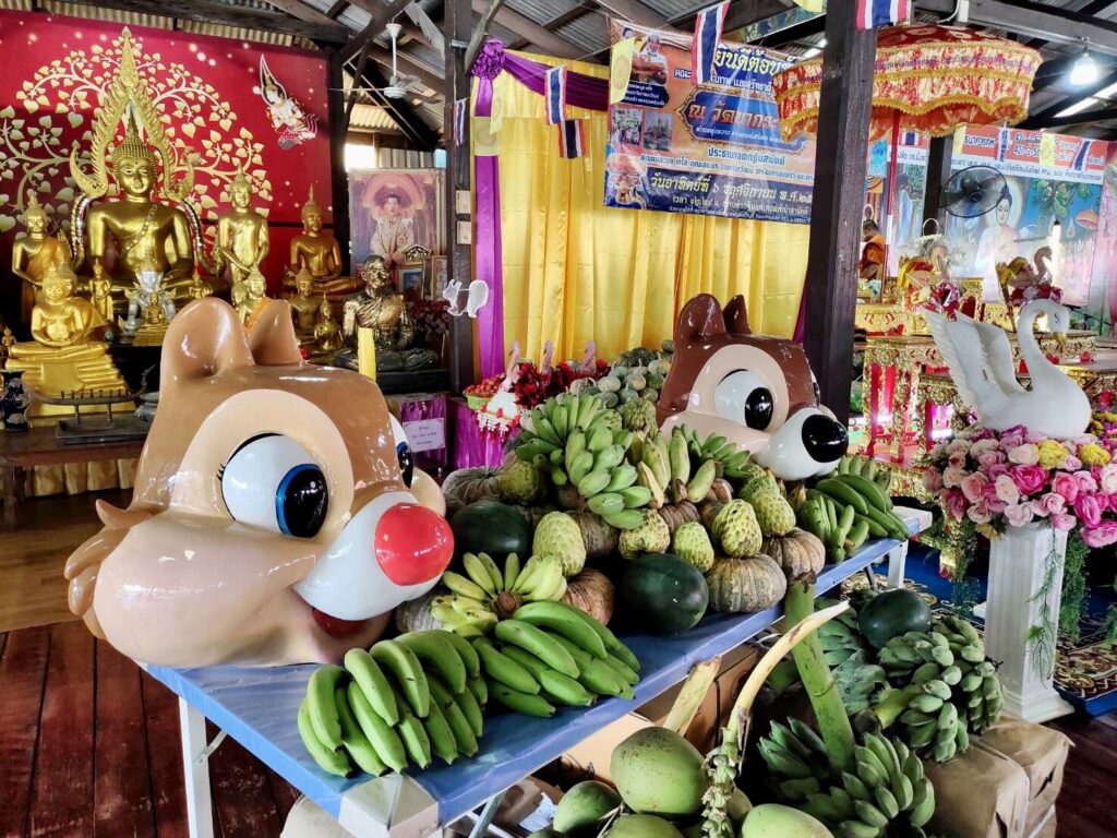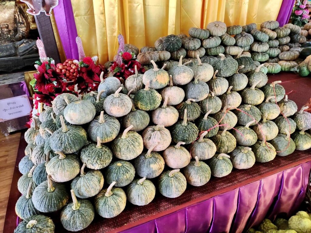 นอกจากนี้ ทางเจ้าภาพ และทางวัด ได้นำผลิตผลทางการเกษตร อาทิ ฟักทอง,แตงโม,น้อยหน่า,กล้วยหอม,มะพร้าว และ มะเขือเทศ แจกจ่ายให้กับผู้ที่มาร่วมงานบุญได้นำกลับไปรับประทาน เพื่อความเป็นศิริมงคล