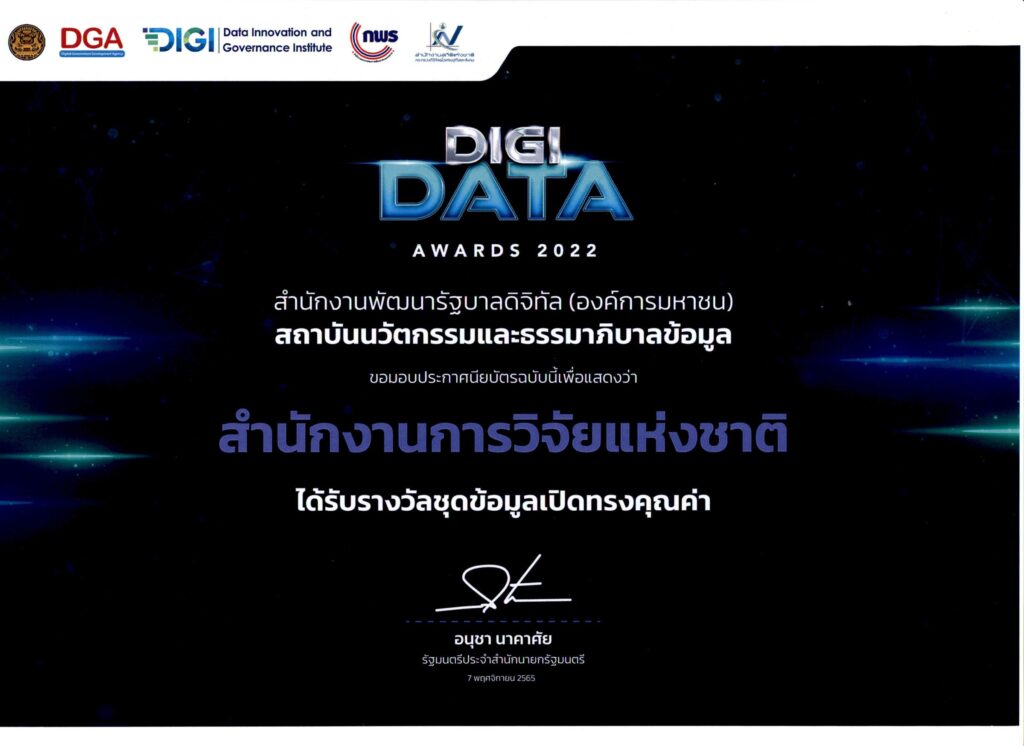 สำนักงานพัฒนารัฐบาลดิจิทัล (องค์การมหาชน) หรือ (สพร.) ได้มีการจัดกิจกรรม “โครงการ DIGI DATA AWARDS มอบรางวัลให้กับหน่วยงานที่เปิดเผยชุดข้อมูลเปิดภาครัฐ” ประจำปี 2565 เพื่อเป็นการกระตุ้นให้เกิดการขับเคลื่อนรัฐบาลดิจิทัลภายใต้แนวคิด “Data Driven Organization” โดยปัจจัยสำคัญในการขับเคลื่อนดังกล่าวคือ การเปิดเผยชุดข้อมูลที่ภาครัฐ ได้จัดเก็บและรวบรวมไว้นำมาเผยแพร่ให้กับประชาชน พร้อมทั้งยังเป็นการสร้างวัฒนธรรมการนำข้อมูลมาช่วยในการตัดสินใจ รวมถึงการสนับสนุนให้เกิดความร่วมมือในการแลกเปลี่ยนข้อมูลระหว่างหน่วยงานและมีการปรับพฤติกรรมการทำงานให้เป็น Data Driven Organization มากขึ้น กล่าวคือ ชุดข้อมูลเปิดภาครัฐ (Open Government Data) เป็นการสนับสนุนการขับเคลื่อนนโยบายเศรษฐกิจและสังคมดิจิทัลให้กับทุกภาคส่วน อีกทั้งยังเป็นการส่งเสริมความมีส่วนร่วมในการสร้างนวัตกรรมจากการใช้ข้อมูลภาครัฐให้เกิดประโยชน์ และสามารถต่อยอดนวัตกรรมบริการให้สอดคล้องกับความต้องการของภาครัฐและภาคประชาชนในการใช้งานบริการรัฐบาลดิจิทัล โดยผู้เข้าร่วมงานประกอบด้วย หน่วยงานที่มีผลงานชุดข้อมูลเปิดยอดเยี่ยมทั้งสิ้น 53 หน่วยงาน สำนักงานการวิจัยแห่งชาติ (วช.) กระทรวงการอุดมศึกษา วิทยาศาสตร์ วิจัยและนวัตกรรม (อว.) ได้รางวัล รางวัลชุดข้อมูลเปิดทรงคุณค่า
