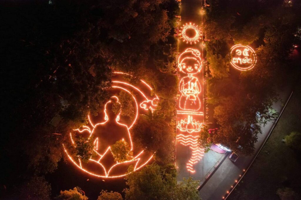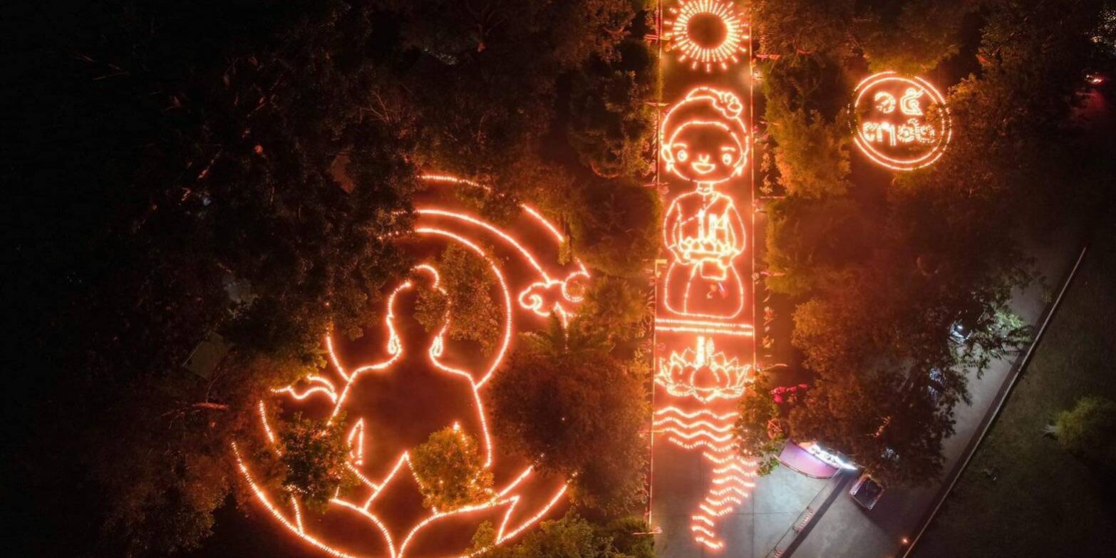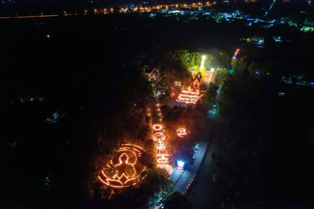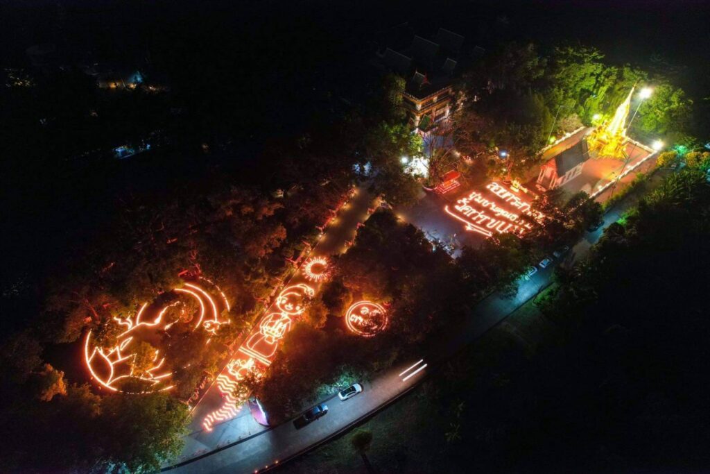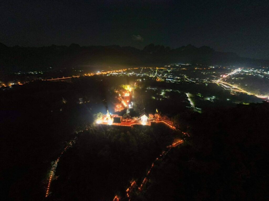 วันอังคารที่ ๘ พฤศจิกายน พุทธศักราช ๒๕๖๕ เวลา ๒๐.๐๐ น. พระครูวิลาศกาญจนธรรม, ดร. เจ้าอาวาสวัดท่าขนุน รองเจ้าคณะอำเภอทองผาภูมิ (๒) ประธานชุมชนคุณธรรมต้นแบบวัดท่าขนุน ประธานหน่วยอบรมประชาชนประจำตำบลท่าขนุน ประธานสภาวัฒนธรรมอำเภอทองผาภูมิ นำนักท่องเที่ยวชมภาพมุมสูงของการตามประทีป ๑๕,๐๐๐ ดวงถวายเป็นพุทธบูชา ณ ยอดเขาพระพุทธเจติยคีรี วัดท่าขนุน หมู่ที่ ๑ ตำบลท่าขนุน อำเภอทองผาภูมิ จังหวัดกาญจนบุรี