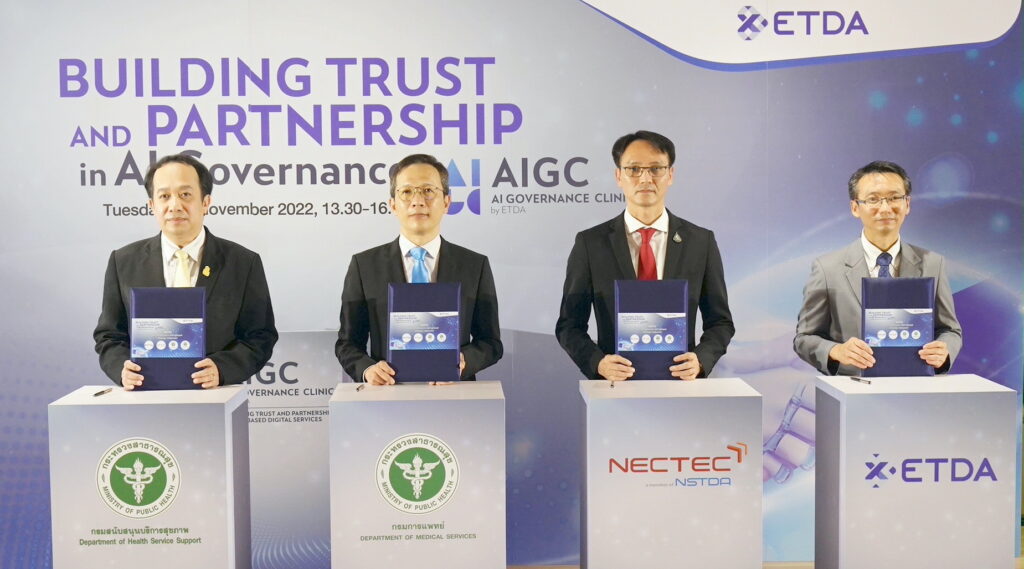 ดังนั้น การพัฒนาบริการดิจิทัลตลอดจนการมีธรรมาภิบาลปัญญาประดิษฐ์ (Digital Service and AI Governance) โดยเฉพาะในเรื่องของ AI Governance จะช่วยลดความเสี่ยงที่อาจจะเกิดขึ้น ซึ่งจะนำไปสู่การสร้างความเชื่อมั่นต่อการทำธุรกรรมทางอิเล็กทรอนิกส์ที่มีความมั่นคงปลอดภัย น่าเชื่อถือ และยังเป็นอีกส่วนสำคัญในการเพิ่มความมั่นใจให้กับนักลงทุนต่างประเทศในระยะยาว จึงเป็นอีกภารกิจหนึ่งที่ท้าทาย ซึ่ง ETDA ได้มุ่งเน้นผ่านการดำเนินงานทั้งในมุมของการส่งเสริมและการดูแลเกี่ยวกับการใช้เทคโนโลยี AI มาอย่างต่อเนื่อง ทั้งในมุมของการศึกษาทั้งในมุมของกฎหมาย มาตรฐาน แนวทางปฏิบัติ เพื่อเป็นกรอบหรือทิศทางในการใช้งานที่เกี่ยวข้องสอดคล้องกับ AI Governance,การศึกษา รวบรวมข้อมูลจากหลากหลายประเทศ เพื่อพัฒนาให้เกิด AI Standard Landscape ของไทย ต่อยอดเพื่อพัฒนาให้เกิดเป็นข้อเสนอแนะ/มาตรฐานที่เกี่ยวข้องกับ การประยุกต์ใช้ AI อย่างมีธรรมาภิบาล รวมถึงการศึกษาหลักเกณฑ์การตรวจประเมินการทำงานของโปรแกรมที่มีการใช้เทคโนโลยีปัญญาประดิษฐ์ การถ่ายทอดความรู้ พัฒนาทักษะ เพื่อให้คนไทยพร้อมและเกิดการนำเทคโนโลยี AI ไปประยุกต์ใช้งานได้อย่างมีประสิทธิภาพ โดยจะดำเนินการผ่านสถาบัน ADTE by ETDA (Academy of Digital Transformation by ETDA),การเปิดพื้นที่แลกเปลี่ยนความรู้ผ่าน AI Webinar ที่ชวนผู้เชี่ยวชาญหลากหลายอาชีพ ทั้งในและต่างประเทศมาร่วมแชร์มุมมอง เปิดโลก AI Governance ร่วมกัน และการจัดทำ e-Book ชุด AI the Series ที่ปล่อยอย่างต่อเนื่องทุกเดือนในช่วงที่ผ่านมา ที่จะเข้ามาช่วยให้ทุกเรื่องเกี่ยวกับ AI เป็นเรื่องใกล้ตัวและเข้าใจง่ายมากยิ่งขึ้น เป็นต้น จนนำมาสู่การต่อยอดเปิดตัว “ศูนย์ธรรมาภิบาลปัญญาประดิษฐ์ หรือ AI Governance Clinic by ETDA (AIGC)” ในงาน “Building Trust and Partnership in AI Governance” ในวันนี้ โดยศูนย์ AIGC จะเป็นแหล่งรวมความรู้และผู้เชี่ยวชาญด้านธรรมาภิบาลปัญญาประดิษฐ์จากประเทศชั้นนำทั่วโลก เพื่อผลักดันให้เกิดการดำเนินงานเพื่อขับเคลื่อนให้เกิดการประยุกต์ใช้งาน AI อย่างมีธรรมาภิบาลร่วมกัน โดยจะทยอยดำเนินงานกับ Sector ที่สำคัญโดยเริ่มจาก Health