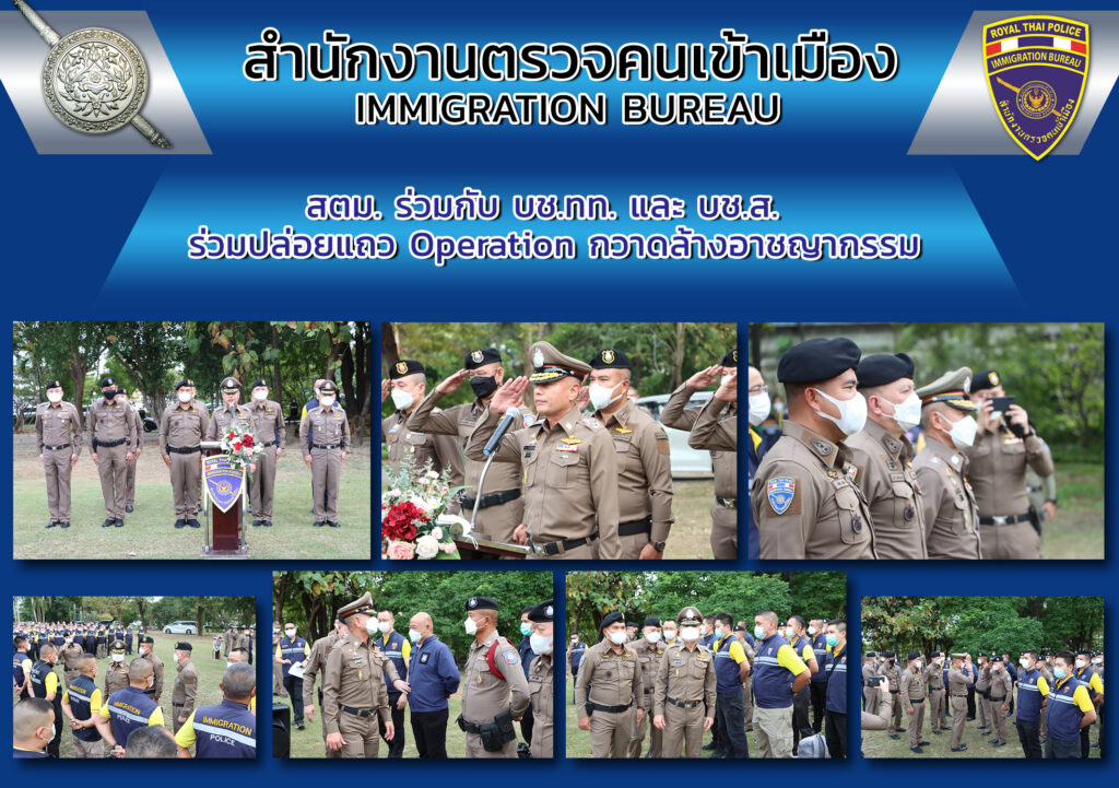4.สำนักงานตรวจคนเข้าเมือง ร่วมกับ ตำรวจท่องเที่ยว เปิดปฏิบัติการ Operation X-ray พื้นที่ หาคนต่างด้าวที่อยู่ในราชอาณาจักรโดยผิดกฎหมาย ในวันพุธที่ 9 พ.ย. 65 ณ โรงแรมรามาการ์เด้น เขตหลักสี่ กรุงเทพฯ โดยมี พล.ต.อ.รอย อิงคไพโรจน์ รอง ผบ.ตร. เป็นประธาน และมีข้าราชการตำรวจในสังกัดสำนักงานตรวจคนเข้าเมือง จำนวน 500 นาย และข้าราชการตำรวจสังกัดตำรวจท่องเที่ยว จำนวน 50 นาย รวมข้าราชการตำรวจที่เข้าร่วมทั้งสิ้น 550 นาย ออกตรวจ Operation X-ray พื้นที่จุดเสี่ยงในกรุงเทพฯ และปริมณฑล มีผลการปฏิบัติ สามารถจับกุมบุคคลต่างด้าวที่อยู่เกินกำหนดอนุญาต (Overstay) จำนวน 7 ราย จับกุมคนต่างด้าวหลบหนีเข้าเมือง จำนวน 1 ราย เปรียบเทียบปรับเจ้าบ้านหรือผู้ครอบครองเคหสถานไม่แจ้งที่พักอาศัยกรณีรับคนต่างด้าวเข้าพักอาศัยตาม ม.38 จำนวน 17 ราย