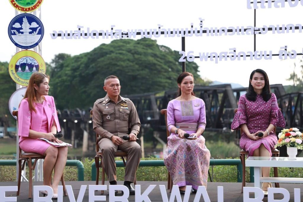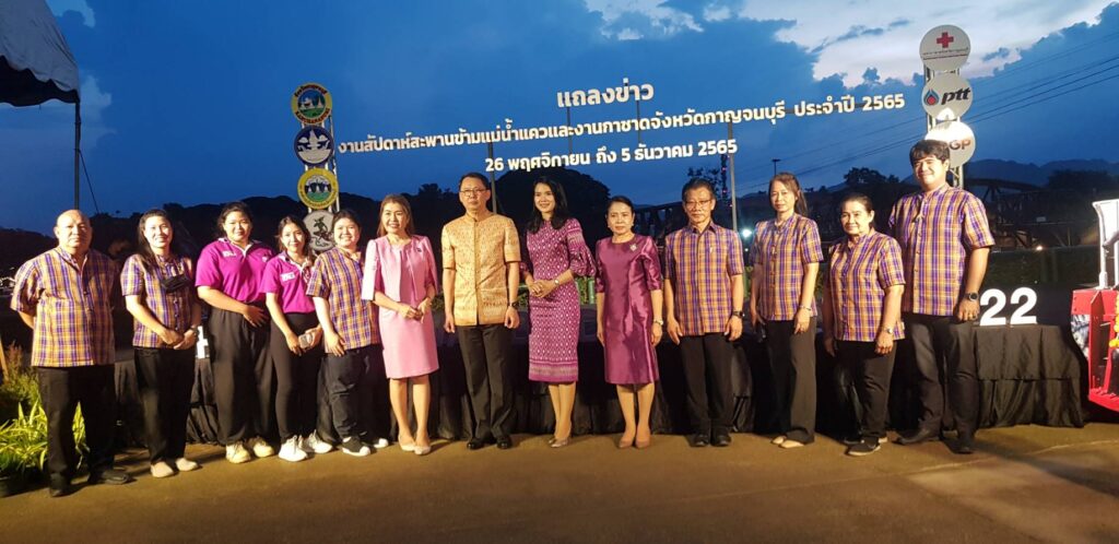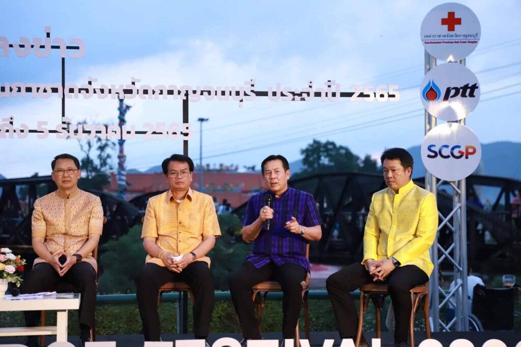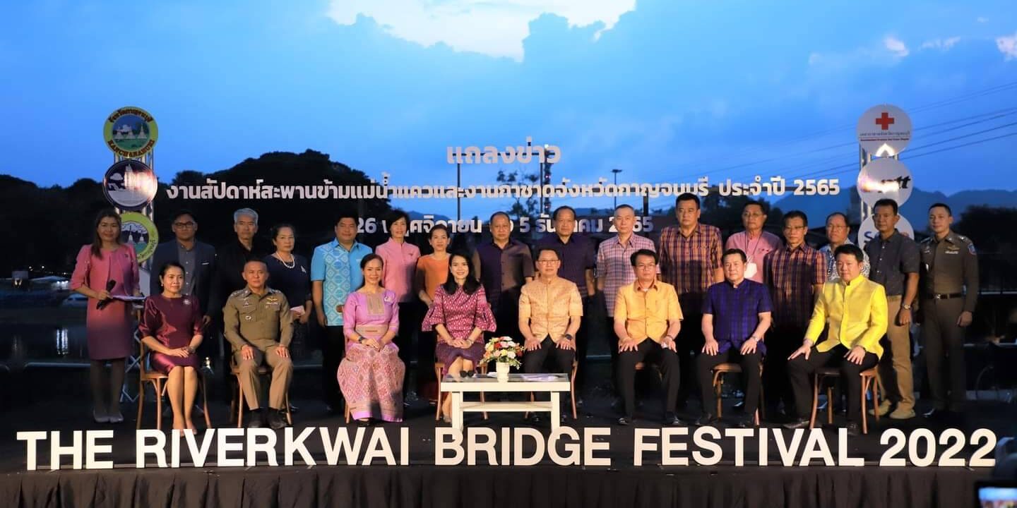 วันนี้ (15 พฤศจิกายน 2565 ) เวลา 17.00 น. ที่ ลานอเนกประสงค์ บริเวณสะพานข้ามแม่น้ำแคว อำเภอเมือง จังหวัดกาญจนบุรี ร้อยโท ทศพล ไชยโกมินทร์ ผู้ว่าราชการจังหวัดกาญจนบุรี เป็นประธานการแถลงข่าวการจัดงานสัปดาห์สะพานข้ามแม่น้ำแควและงานกาชาดจังหวัดกาญจนบุรี ประจำปี 2565 พร้อมด้วย นายชำนาญ ชื่นตา รองผู้ว่าราชการจังหวัดกาญจนบุรี รศ.ดร.พญ.เรวิกา ไชยโกมินทร์ นายกเหล่ากาชาดจังหวัดกาญจนบุรี ดร.กิรดา ลำโครัตน์ ท่องเที่ยวและกีฬาจังหวัดกาญจนบุรี นายพิสิษฐ์ กาญจนภิญพงศ์ รองนายกองค์การบริหารส่วนจังหวัดกาญจนบุรี พันตำรวจเอก วุฒิพงษ์ เย็นจิตต์ รองผู้บังคับการตำรวจภูธรจังหวัดกาญจนบุรี นายแพทย์ประวัติ กิจธรรมกูลนิจ รองนายแพทย์สาธารณสุขจังหวัดกาญจนบุรี ร่วมแถลงข่าวฯ โดยมี หัวหน้าส่วนราชการ และ สื่อมวลชน ร่วมงานเป็นจำนวนมาก