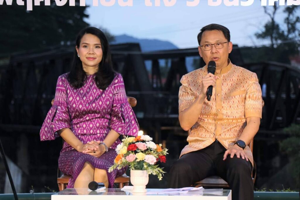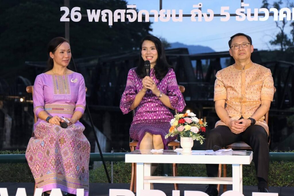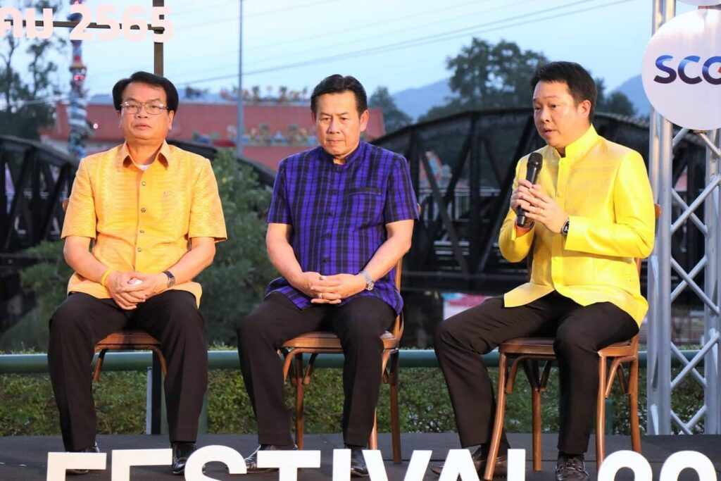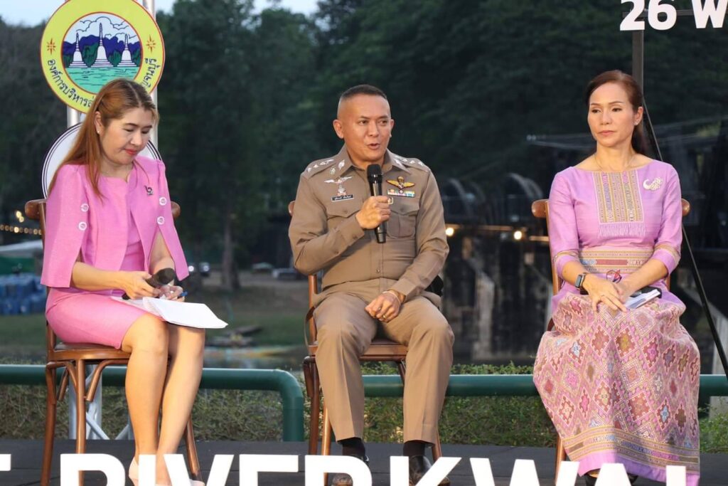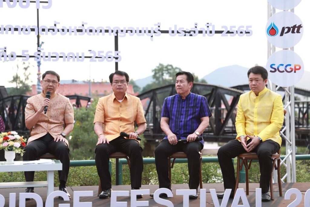 วันนี้ (15 พฤศจิกายน 2565 ) เวลา 17.00 น. ที่ ลานอเนกประสงค์ บริเวณสะพานข้ามแม่น้ำแคว อำเภอเมือง จังหวัดกาญจนบุรี ร้อยโท ทศพล ไชยโกมินทร์ ผู้ว่าราชการจังหวัดกาญจนบุรี เป็นประธานการแถลงข่าวการจัดงานสัปดาห์สะพานข้ามแม่น้ำแควและงานกาชาดจังหวัดกาญจนบุรี ประจำปี 2565 พร้อมด้วย นายชำนาญ ชื่นตา รองผู้ว่าราชการจังหวัดกาญจนบุรี รศ.ดร.พญ.เรวิกา ไชยโกมินทร์ นายกเหล่ากาชาดจังหวัดกาญจนบุรี ดร.กิรดา ลำโครัตน์ ท่องเที่ยวและกีฬาจังหวัดกาญจนบุรี นายพิสิษฐ์ กาญจนภิญพงศ์ รองนายกองค์การบริหารส่วนจังหวัดกาญจนบุรี พันตำรวจเอก วุฒิพงษ์ เย็นจิตต์ รองผู้บังคับการตำรวจภูธรจังหวัดกาญจนบุรี นายแพทย์ประวัติ กิจธรรมกูลนิจ รองนายแพทย์สาธารณสุขจังหวัดกาญจนบุรี ร่วมแถลงข่าวฯ โดยมี หัวหน้าส่วนราชการ และ สื่อมวลชน ร่วมงานเป็นจำนวนมาก