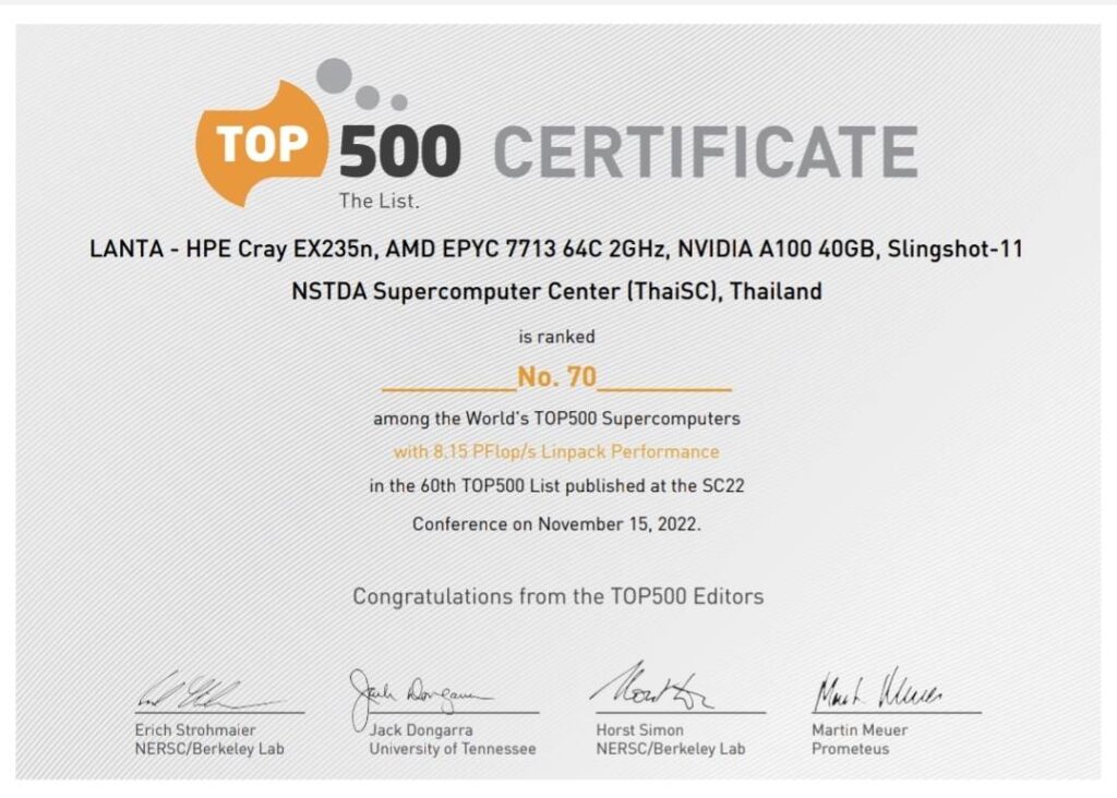 ผลการจัดอันดับ TOP500 หรือการจัดอันดับซูเปอร์คอมพิวเตอร์ที่มีประสิทธิภาพสูงที่สุดในโลก ครั้งที่ 60 เมื่อวันที่ 15 พ.ย.65 ได้ประกาศว่าเครื่องซูเปอร์คอมพิวเตอร์ LANTA โดยสำนักงานพัฒนาวิทยาศาสตร์และเทคโนโลยีแห่งชาติ (สวทช.) ภายใต้กระทรวงการอุดมศึกษา วิทยาศาสตร์ วิจัยและนวัตกรรม (อว.) ถูกจัดให้เป็นเครื่องซูเปอร์คอมพิวเตอร์ที่ประสิทธิภาพสูงสุดอันดับ 70 ของโลก หรือนับเป็นอันดับหนึ่งในอาเซียน ด้วยประสิทธิภาพในการคำนวณที่สูงถึง 8.1 พันล้านล้านคำสั่งต่อวินาที