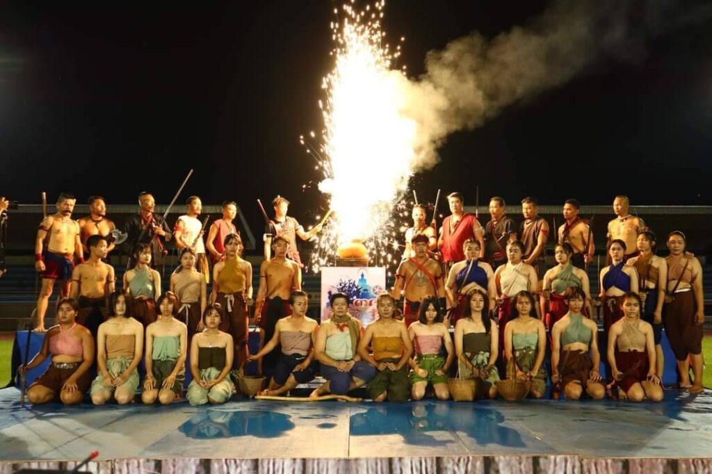 จากนั้นเป็นการกล่าวปฏิญาณตนของนักกีฬาและผู้ตัดสินโดยมีชุดการแสดงตำนานบ้านระจัน สำนักดาบศิษย์ปู่บ้านระจันเชื่อมโยงเข้าสู่พิธีจุดคบเพลิงโดยนายสรรอรรถ ดาบบัง นักกรีฑาทีมชาติไทยปี 2565 เป็นผู้จุดไฟในกระถางคบเพลิงจากความรักสามัคคีช่วงชัชวาลย์ร่วมบันทึกเล่าขานตำนานชาวบ้านบางระจัน ถือเป็นการเปิดฉากการแข่งขันกีฬาเยาวนชนแห่งชาติครั้งที่ 38 สิงห์บุรีเกมส์อย่างเป็นทางการ