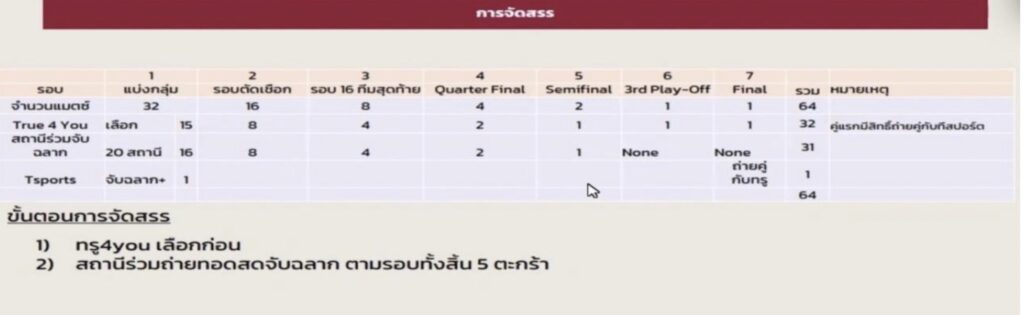 - กรณีกลุ่มทรูให้การสนับสนุนจำนวน 300 ล้านบาท ได้รับสิทธิประโยชน์ ครอบคลุมสิทธิ์การถ่ายทอด ทุกช่องทาง ทุกแพลตฟอร์ม แบบ exclusive ได้สิทธิ์ในการเลือกคู่แข่งขัน จำนวน 32 แมทช์ และได้นาทีโฆษณา จากช่องทีวีดิจิตอลที่ร่วมถ่ายทอดจาก กกท . รายละเอียดตามภาพประกอบ