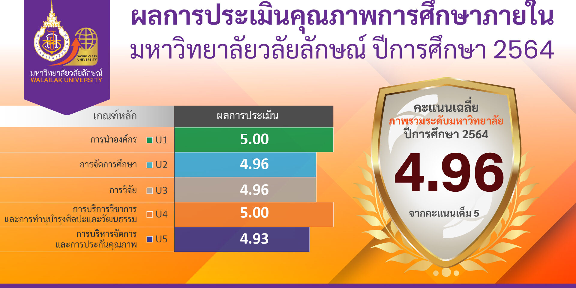 ศาสตราจารย์ ดร.ธวัชชัย ศุภดิษฐ์ รักษาการแทนรองอธิการบดี ม.วลัยลักษณ์ เปิดเผยถึงผลประเมินการประกันคุณภาพการศึกษาภายใน ระดับมหาวิทยาลัย ตามกรอบ WUQA โดยมีเกณฑ์พื้นฐานสากล AUN-QA (ASEAN University Network Quality Assurance) ในรอบปีการศึกษา 2564 ผลปรากฏว่า มหาวิทยาลัยวลัยลักษณ์ได้รับผลการประเมิน คะแนนเฉลี่ย 4.96 คะแนน จากคะแนนเต็ม 5 อยู่ในระดับดีมาก และถือเป็นคะแนนสูงที่สุดตั้งแต่มีการก่อตั้งมหาวิทยาลัยแห่งนี้และถือว่าเป็นผลคะแนนที่สูงขึ้นอย่างต่อเนื่องนับตั้งแต่ปี 2560 เป็นต้นมา