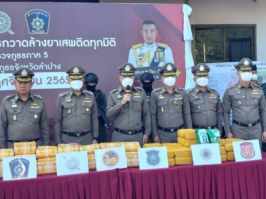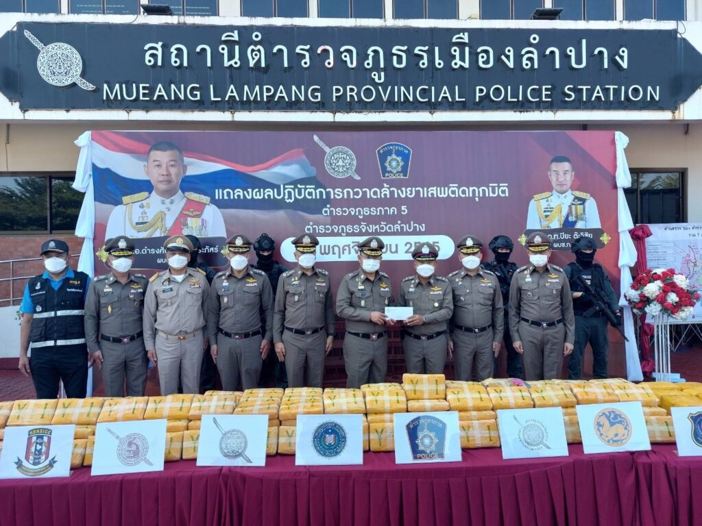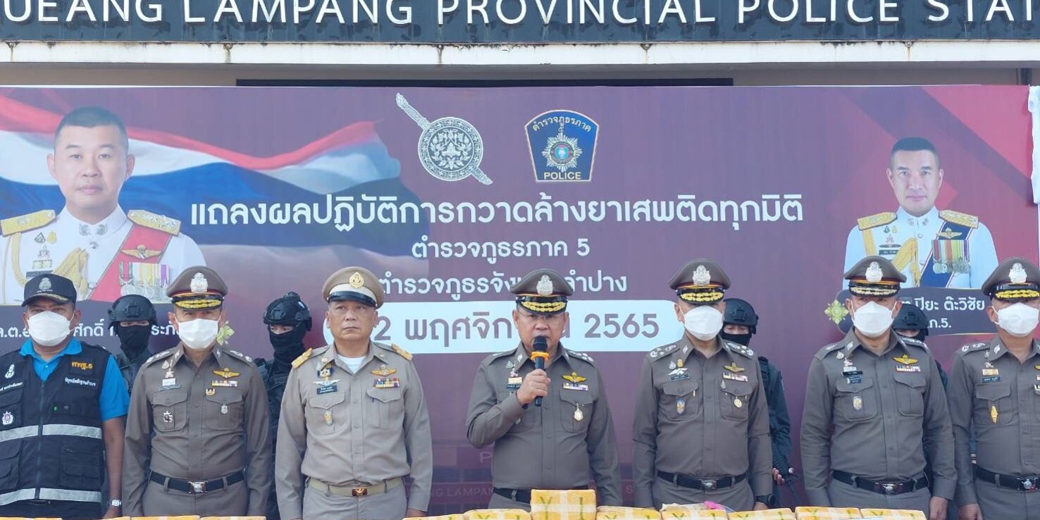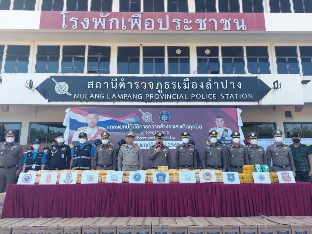 วันนี้ (22 พ.ย.65) เวลา 10.00 น. ที่ สถานีตำรวจภูธรเมืองลำปาง จังหวัดลำปาง พล.ต.อ.ดำรงศักดิ์ กิตติประภัสร์ ผบ.ตร. พร้อมด้วย พล.ต.อ.ชินภัทร สารสิน รอง ผบ.ตร. ,พล.ต.ท.ปิยะ ต๊ะวิชัย ผบช.ภ.5,พล.ต.ท.ทนงค์ ทองประดับเพชร ที่ปรึกษา(สบ7)สพฐ.ตร. รรท.ผบก.ศพฐ.5, พล.ต.ต.เฉลิมพล จินตรัตน์ รอง ผบช.ภ.5 ,พล.ต.ต.พฤทธิพงษ์ ประยูรศิริ รอง ผบช.ภ.5 ,พล.ต.ต.พิเชษฐ จีระนันตสิน รอง ผบช.ภ.5,พล.ต.ต.วีรชน บุญทวี รอง ผบช.ภ.5,พล.ต.ต.วรพงศ์ คำลือ ผบก.สส.ภ.5 , พล.ต.ต.มงคล สัมภาวะผล ผบก.ภ.จว.ลำปาง ,พล.ต.ต.ธนะรัชต์ ชุ่มสวัสดิ์ ผบก.ศฝร.ภ.5 , นายชัชวาล ฉายะบุตร ผู้ว่าราชการจังหวัดลำปาง, นายศานิต อ่อนเปี่ยม นักสืบสวนสอบสวนชำนาญการพิเศษ ปปส.ภาค 5 , พ.อ.กวิน ยาวิชัย รอง เสธ.มทบ.32 ได้ร่วมกันแถลงผลการจับกุม คดียาเสพติดรายสำคัญ ผู้ต้องหา 1 คน พร้อมของกลางยาบ้าจำนวน 5 ล้านเม็ด คีตามีน(ยาเค) จำนวน 101 กิโลกรัม และรถยนต์บรรทุก 6 ล้อ จำนวน 1 คัน