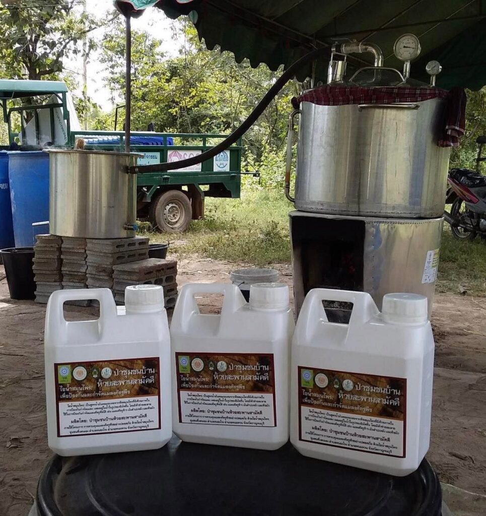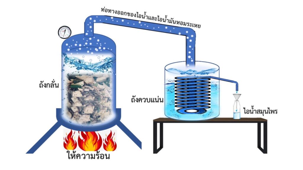 ดร.จรงค์ศักดิ์ พุมนวน จากคณะเทคโนโลยีการเกษตร สถาบันเทคโนโลยีพระจอมเกล้าเจ้าคุณทหารลาดกระบัง (สจล.) เปิดเผยว่า การใช้สารสกัดจากพืชสมุนไพรด้วยเทคโนโลยี “ไอน้ำสมุนไพร” ในการป้องกันกำจัดแมลงศัตรูพืช เป็นเทคโนโลยีที่ทีมวิจัยพัฒนามาจากความรู้ของคนในชุมชนบ้านรางยอม ตำบลหนองโรง อำเภอพนมทวน จังหวัดกาญจนบุรี โดยอาศัยหลักการทำงานเหมือนกับการกลั่นน้ำมันหอมระเหยจากพืชทั่วไป คือ นำพืชสมุนไพรตามสูตรที่ต้องการ ล้างให้สะอาดแล้วสับให้ละเอียด ผสมกับน้ำสะอาดตามสัดส่วนที่กำหนดใส่ในถังกลั่นให้ความร้อนจนน้ำ เดือด ขณะที่น้ำในถังกลั่นเดือดไอน้ำจะพาน้ำมันหอมระเหยจากพืชออกมาทางท่อซึ่งจะไปผ่านถังควบแน่น ไอน้ำและน้ำมันหอมระเหยจะถูกควบแน่นเป็นของเหลวออกมา ใช้เวลาประมาณ 3-4 ชั่วโมง ได้ไอน้ำสมุนไพรประมาณ 25-30 ลิตร ก่อนนำไปใช้งานต้องมีการผสมกับสารช่วยผสมระหว่างน้ำมันหอมระเหยกับน้ำก่อน