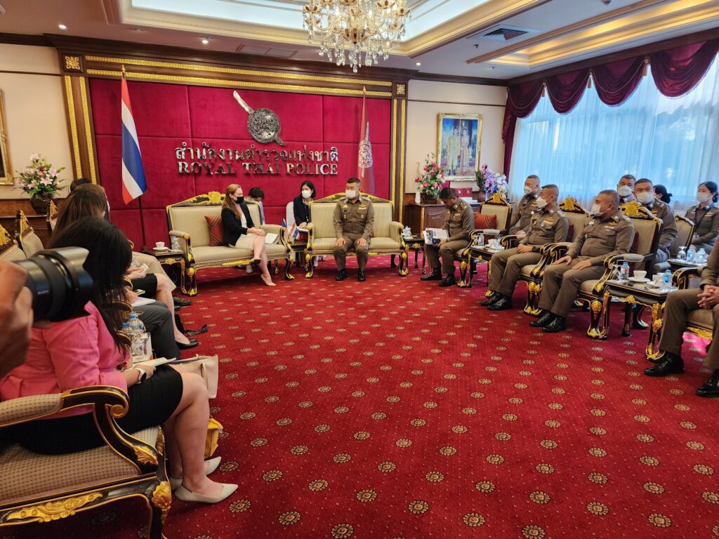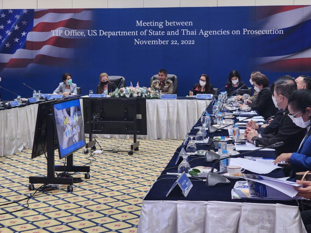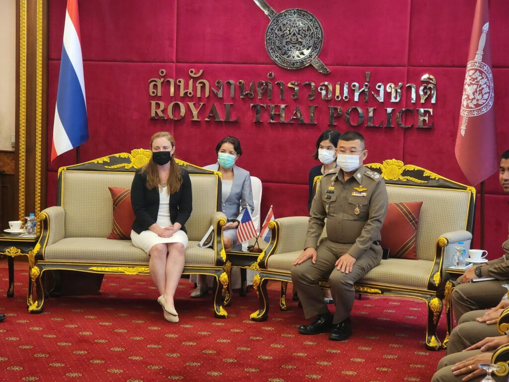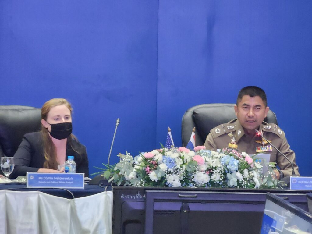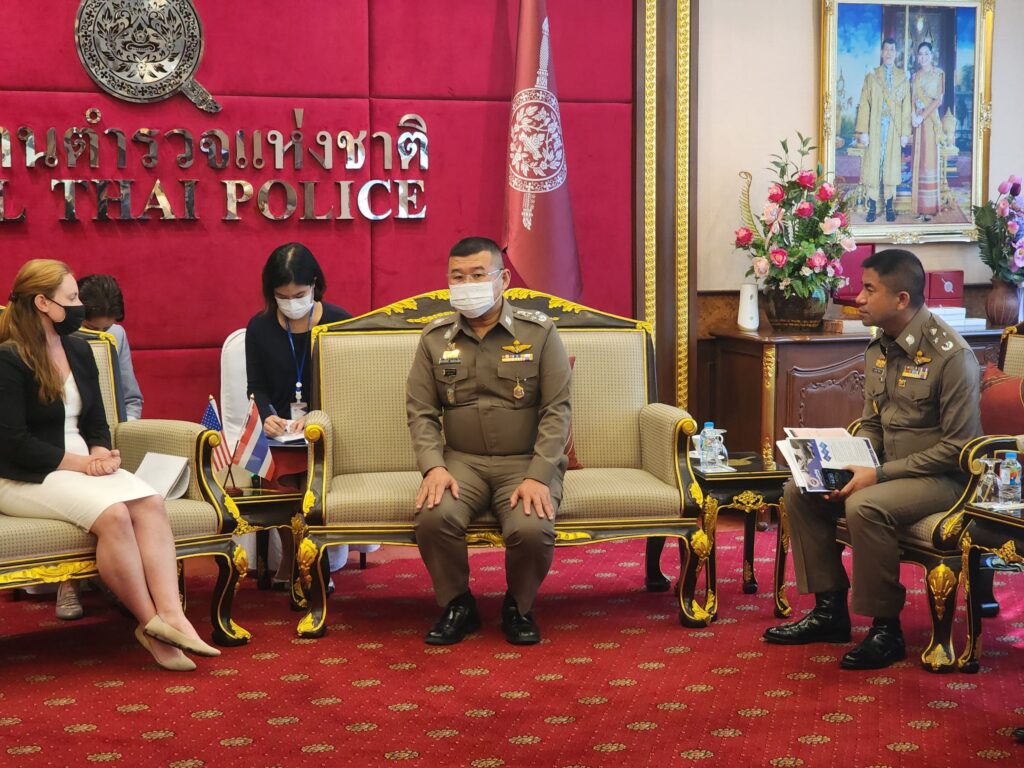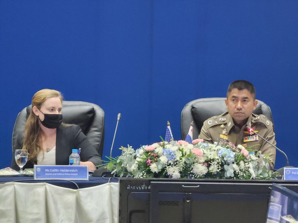 วันที่ 22 พ.ย.65 เวลา 14.00 น. : พล.ต.อ.ดำรงศักดิ์ กิตติประภัสร์ ผบ.ตร. พร้อมด้วย พล.ต.อ.สุรเชษฐ์ หักพาล รอง ผบ.ตร. ในฐานะ ผอ.ศพดส.ตร. พร้อมคณะผู้แทนไทยจากหลายหน่วยงานทั้งจากภาครัฐ เช่น กระทรวงการต่างประเทศ,กระทรวงยุติธรรม,กระทรวงแรงงาน,กระทรวงพัฒนาสังคมและความมั่นคงของมนุษย์ และภาคประชาสังคม เช่น LPN IJM Stella maris และ Hug Project ได้ร่วมกันให้การต้อนรับผู้แทนจากสหรัฐอเมริกา นำโดย น.ส.เคทลีน ไฮเดนรีช เจ้าหน้าที่สำนักงานตรวจสอบและต่อต้านการค้ามนุษย์ พร้อมคณะ ได้ให้เกียรติมาเยี่ยมชม ศูนย์พิทักษ์เด็ก สตรี ครอบครัว ป้องกันปราบปรามการค้ามนุษย์ และภาคประมง สำนักงานตำรวจแห่งชาติ (ศพดส.ตร.) ณ อาคาร 1 สำนักงานตำรวจแห่งชาติ เพื่อเยี่ยมชม และสังเกตการณ์การทำงานของ ศพดส.ตร. หลังจากที่ผลการปฏิบัติด้านการดำเนินคดีมีความก้าวหน้าอย่างก้าวกระโดด จนทำให้ประเทศไทยก้าวขึ้นสู่ Tier 2 จากการประเมิน TIP Report ในปีที่ผ่านมา