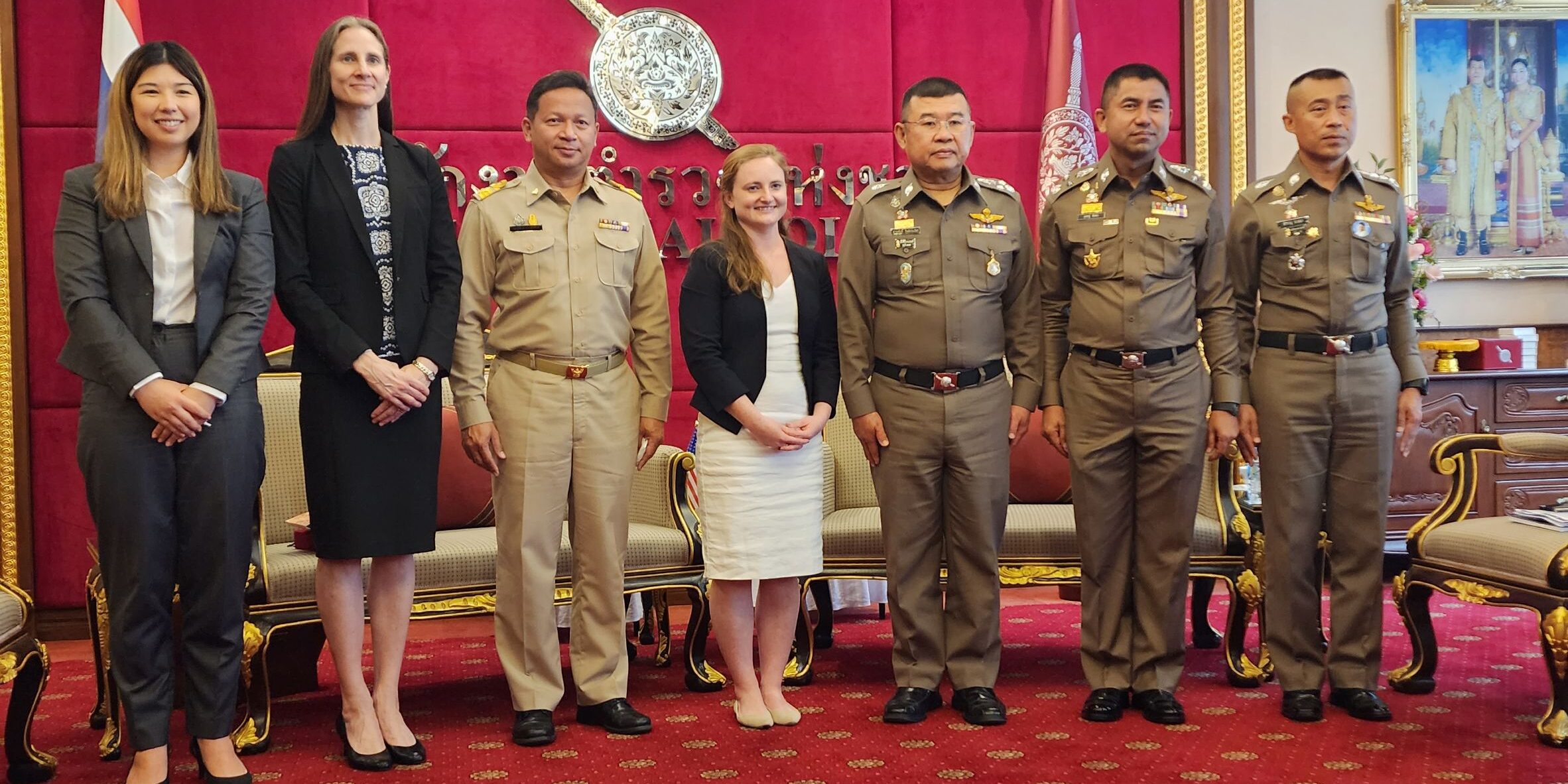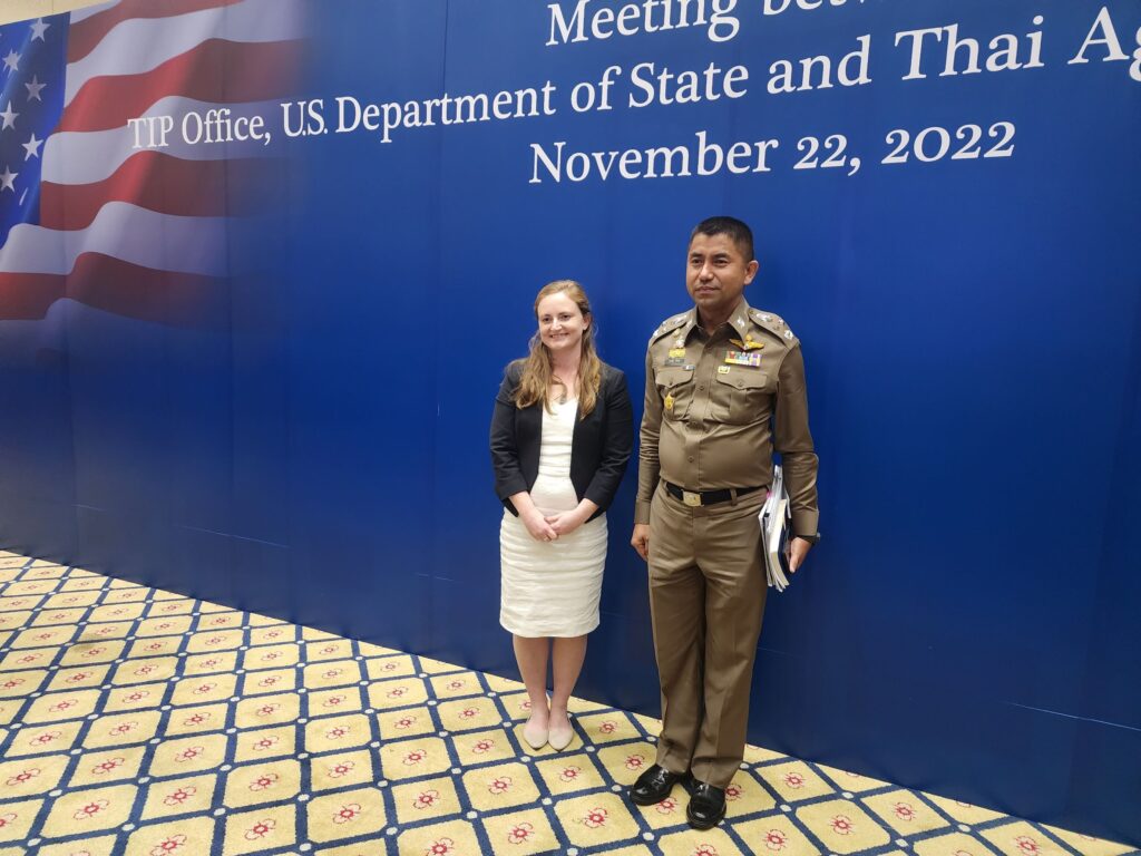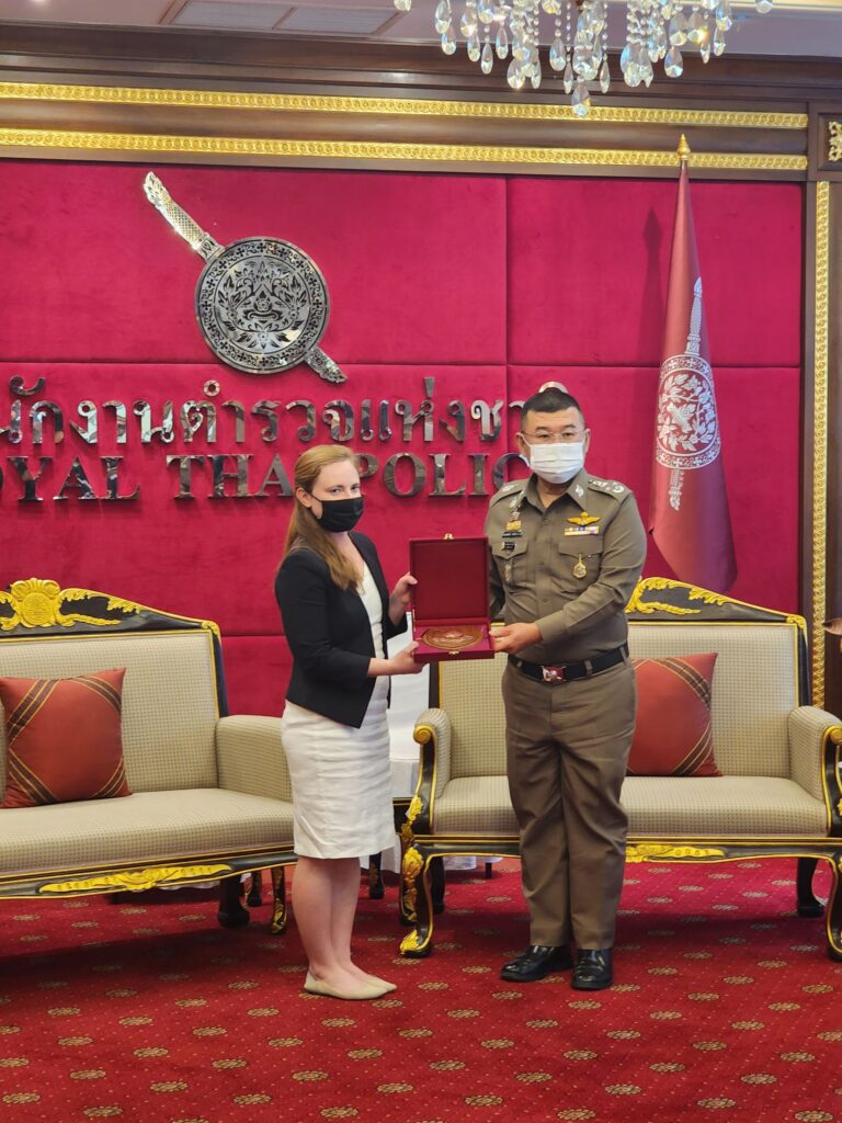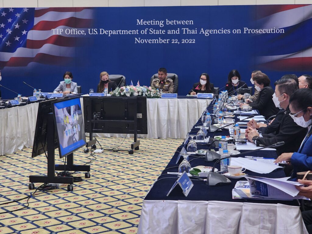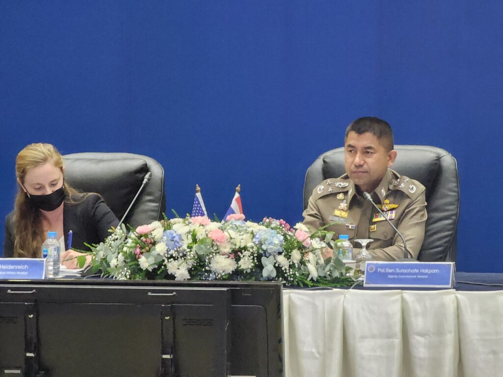 วันที่ 22 พ.ย.65 เวลา 14.00 น. : พล.ต.อ.ดำรงศักดิ์ กิตติประภัสร์ ผบ.ตร. พร้อมด้วย พล.ต.อ.สุรเชษฐ์ หักพาล รอง ผบ.ตร. ในฐานะ ผอ.ศพดส.ตร. พร้อมคณะผู้แทนไทยจากหลายหน่วยงานทั้งจากภาครัฐ เช่น กระทรวงการต่างประเทศ,กระทรวงยุติธรรม,กระทรวงแรงงาน,กระทรวงพัฒนาสังคมและความมั่นคงของมนุษย์ และภาคประชาสังคม เช่น LPN IJM Stella maris และ Hug Project ได้ร่วมกันให้การต้อนรับผู้แทนจากสหรัฐอเมริกา นำโดย น.ส.เคทลีน ไฮเดนรีช เจ้าหน้าที่สำนักงานตรวจสอบและต่อต้านการค้ามนุษย์ พร้อมคณะ ได้ให้เกียรติมาเยี่ยมชม ศูนย์พิทักษ์เด็ก สตรี ครอบครัว ป้องกันปราบปรามการค้ามนุษย์ และภาคประมง สำนักงานตำรวจแห่งชาติ (ศพดส.ตร.) ณ อาคาร 1 สำนักงานตำรวจแห่งชาติ เพื่อเยี่ยมชม และสังเกตการณ์การทำงานของ ศพดส.ตร. หลังจากที่ผลการปฏิบัติด้านการดำเนินคดีมีความก้าวหน้าอย่างก้าวกระโดด จนทำให้ประเทศไทยก้าวขึ้นสู่ Tier 2 จากการประเมิน TIP Report ในปีที่ผ่านมา