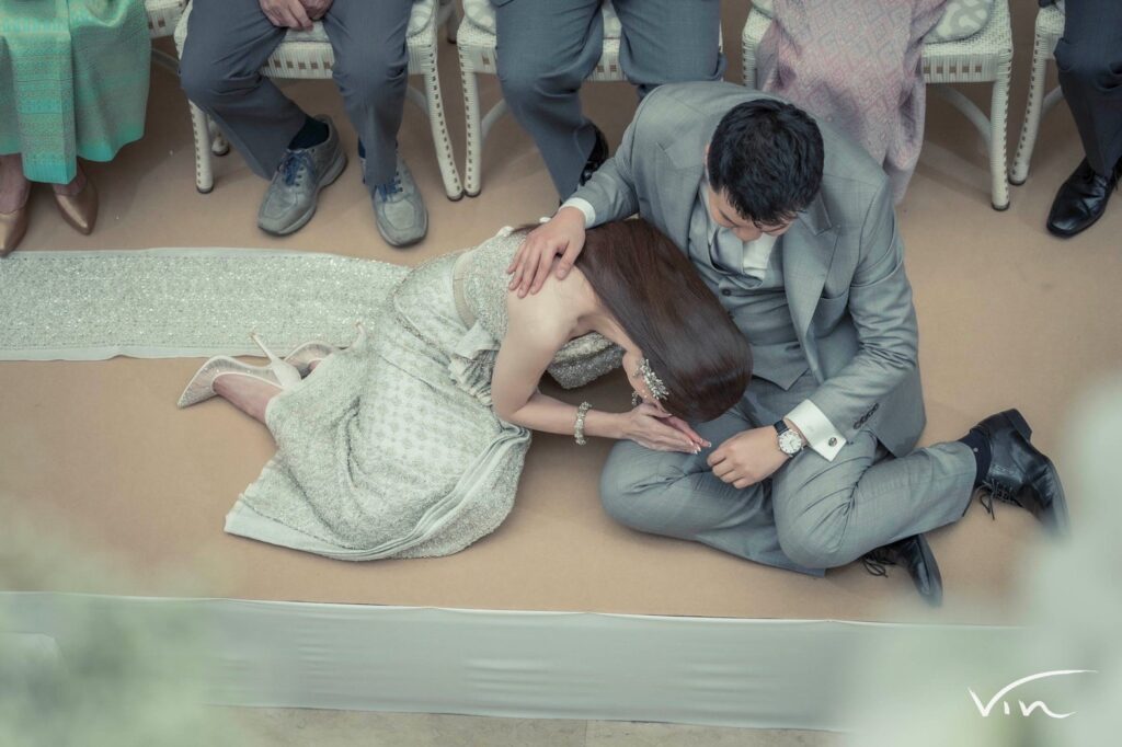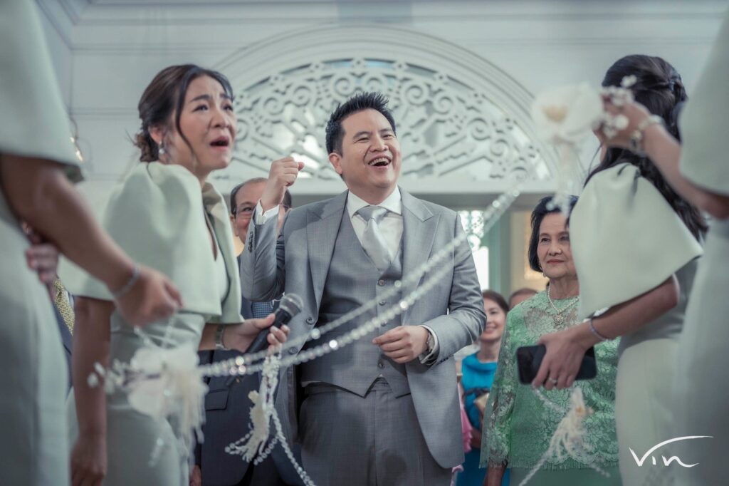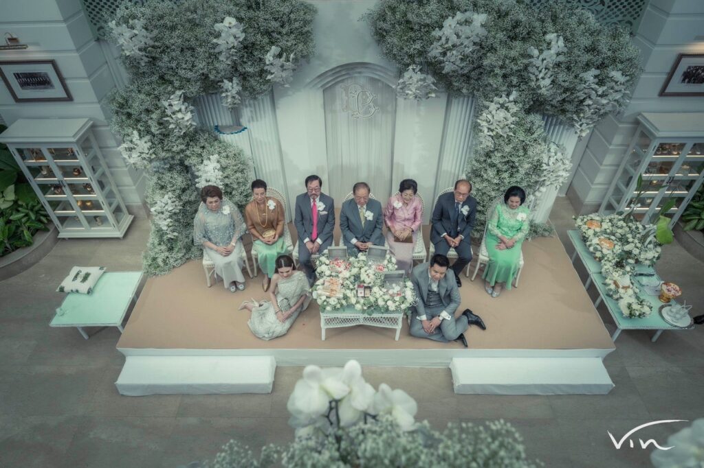โดยบรรยากาศในช่วงเช้าจะเป็นพิธีทางสงฆ์ พิธียกขบวนขันหมาก และพิธีหมั้นสู่ขอ ตามลำดับ ซึ่งในพิธีช่วงเช้ามีแขกเป็นญาติของทั้ง2ฝ่ายแบบอบอุ่นเป็นกันเอง