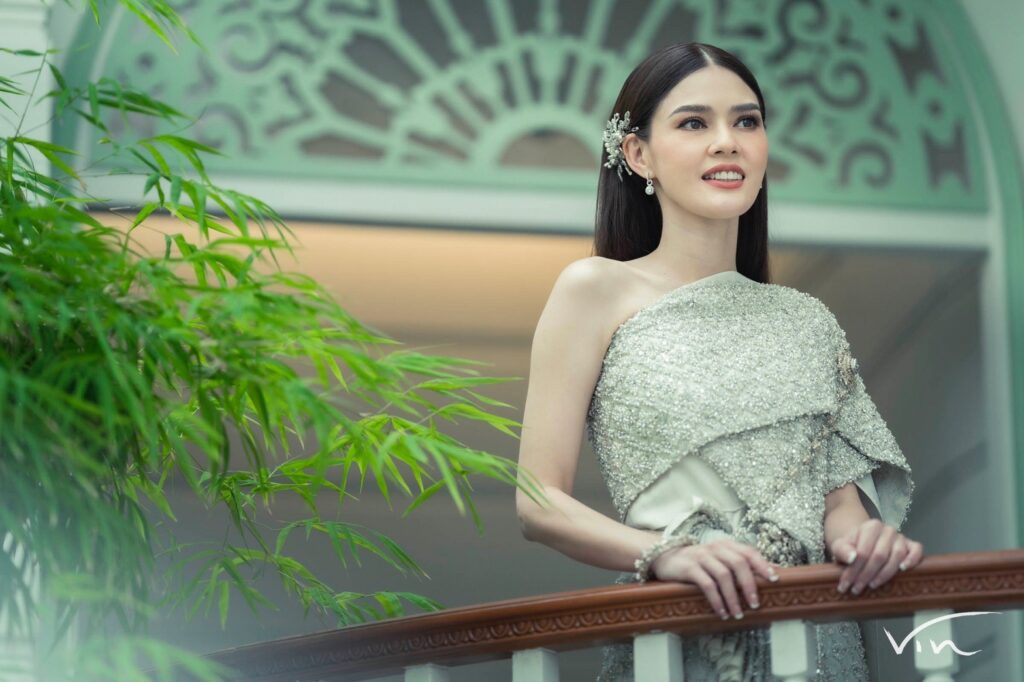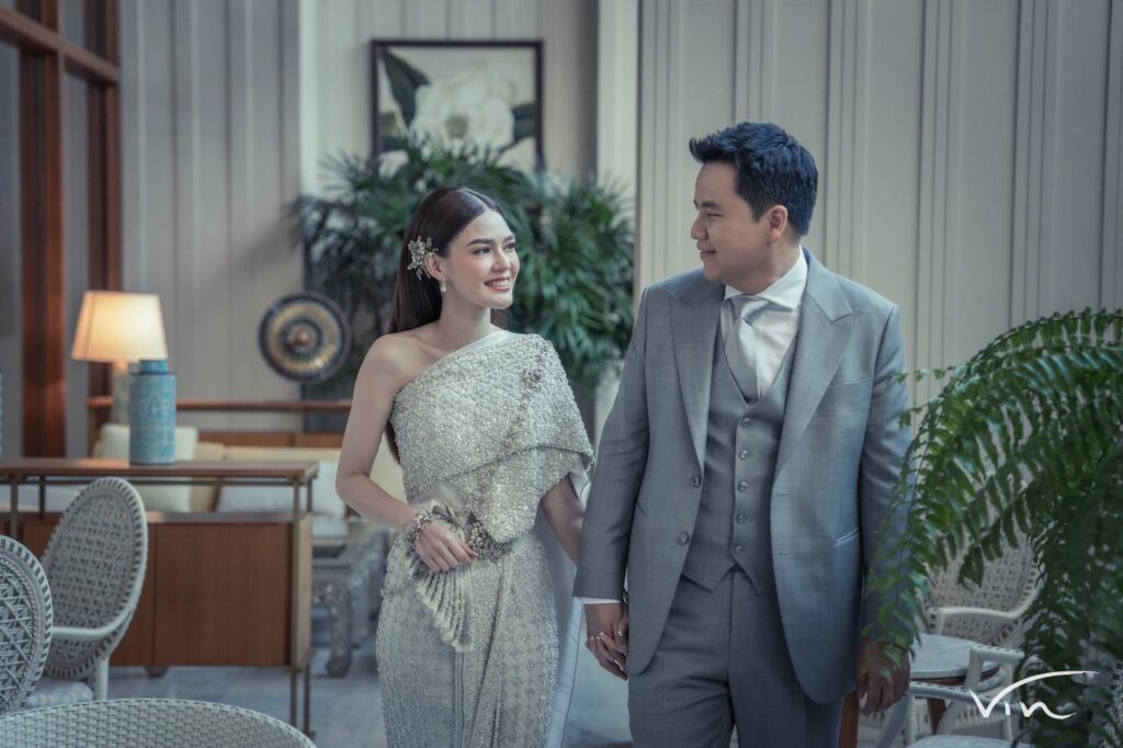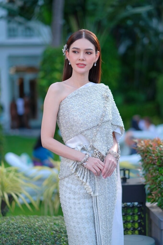 ในส่วนชุดเจ้าสาวช่วงพิธีงานเช้าจากร้าน Amata มูลค่าชุดราคากว่า 5 แสนบาท เป็นชุดคริสตัลไข่มุกและเพชรชวาลอฟกี้ หลายแสนเม็ดที่ปักลงบนสะไบ รวมถึงผ้าไหม ที่ใช้ปล้องแท้จากญี่ปุ่น ที่ใช้หลายแสนเม็ดปักเรียงเป็นลวดลายที่สวยงดงามบนผืนผ้า ทำให้เจ้าสาวใส่แล้วดูแพงเป็นสง่า
